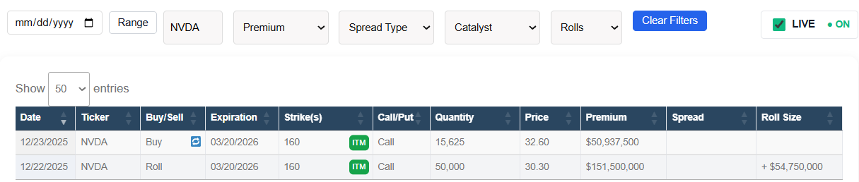 The markets bounced back this week with the Nasdaq leading as it closed up 1.5% for its first higher close in four weeks. This comes after a 7.2% decline for it from its late January highs. The S&P also closed higher by 1% while the Russell 2000 gained 0.6% for the week. This coming Wednesday, February 25th, Nvidia will report earnings after the market close which will be a big catalyst for the markets, especially tech. There is still a big whale sitting in the March 20th $160 calls from December with over $200M worth of calls which they are currently up a little on. They've continued to hold through pullbacks and chop but we will see if they close it out or adjust the position ahead of earnings. This is the Nvidia flow from my UOA database: