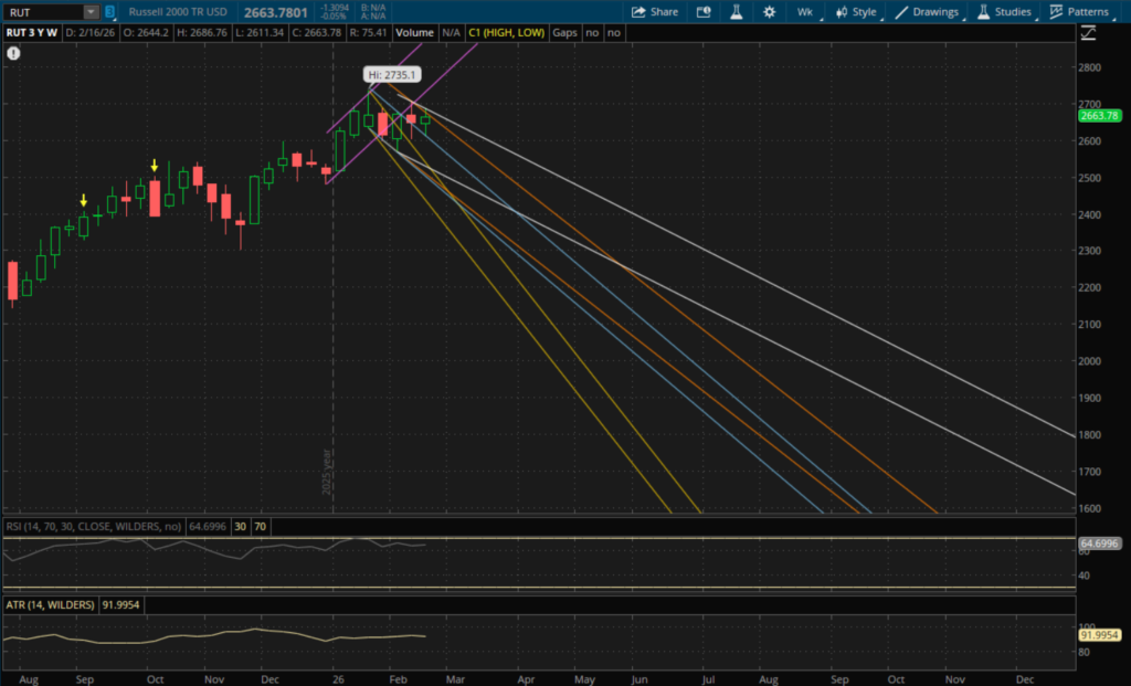 The Nasdaq did not break through its primary downtrend this week and doesn't start any new weekly trends going into next week. Resistance from its primary downtrend (white) will be at about 23,070 on a continued bounce. If it breaks through this level it will start a new trend and we will have to wait and see how it closes to determine levels from this new trend. But, if it does break above it then I would watch the 23,570 area as the next key resistance level. While its prior uptrend (purple) remains as valid resistance, it's very far around 24,225 which would be new all time highs, but that is highly unlikely to be tested next week. If we do get another big sell-off then the next big support to watch will also be from this primary downtrend at about 21,775.