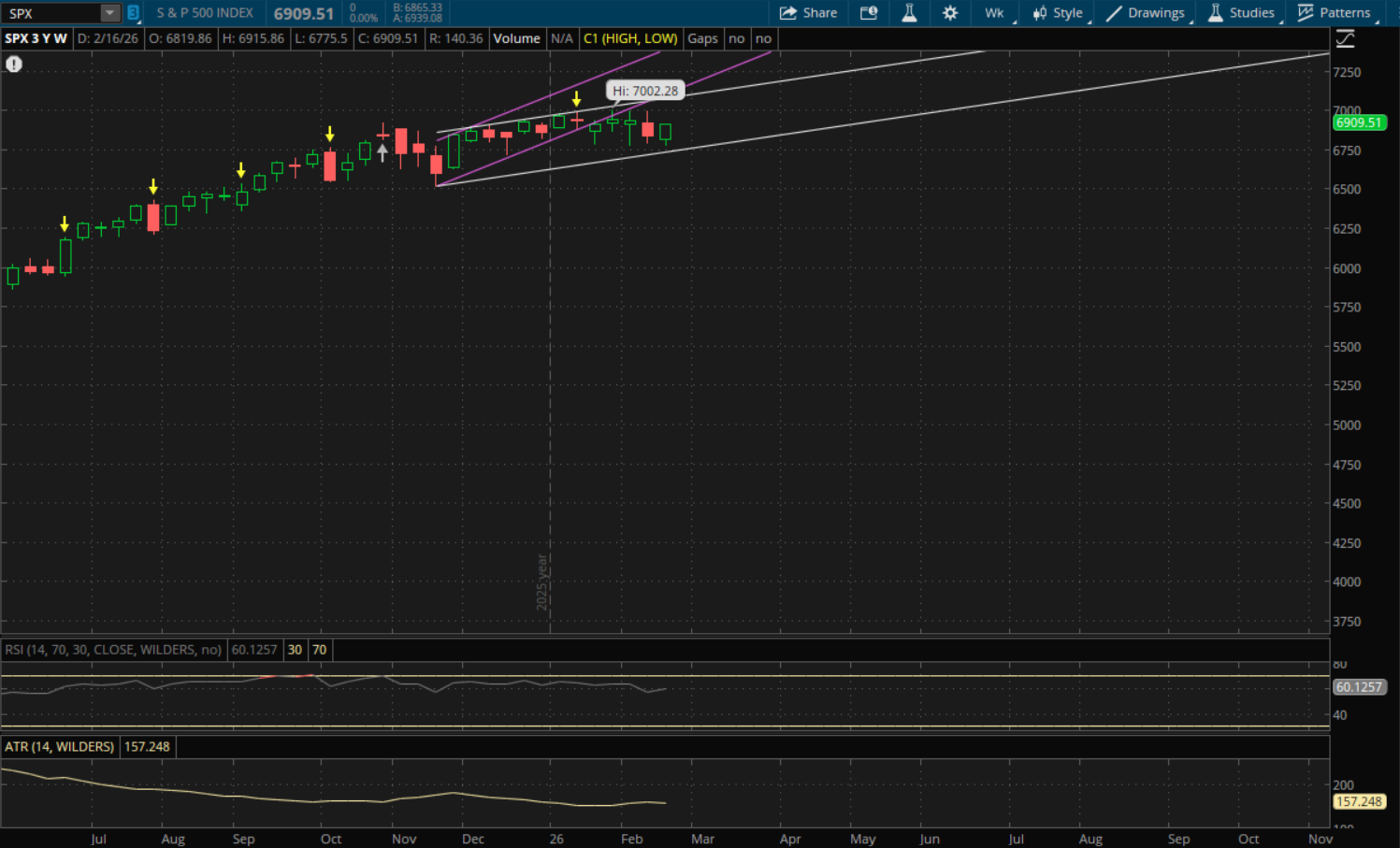 The S&P did not break through its primary trend either so it also remains in the same uptrend that it has been in since October. It almost got down to that support this week which was at 6,735-6,740 but it didn't quite make it as it put in a low of 6,775.50. That uptrend support will now be at about 6,755 on a pullback next week while resistance from the same primary trend will be just below 7,100. If we were to get that big rally and it breaks through 7,100 then its prior uptrend (purple) would come into play with resistance at 7,150.