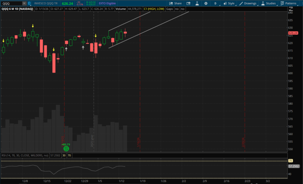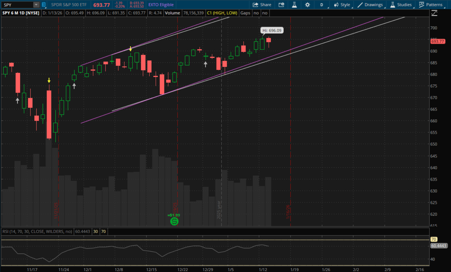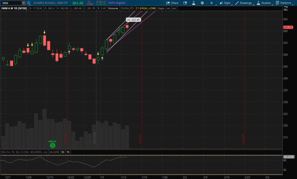 We got our first big earnings report of the earnings season with JPM reporting this morning as they posted strong results and beat on the top and bottom lines. Despite that, the stock sold off over 4% and dragged the rest of the financial sector lower as XLF closed down nearly 2% for the day. The markets also reversed their early gains after futures rallied on a cooler than expected CPI report. IWM held up the best on the day, closing down just 0.06% while QQQ and SPY posted losses of 0.15% and 0.2%, respectively. Tomorrow we may potentially get a vote on the legality of the Trump tariffs by the Supreme Court after it was delayed last week. The VIX has been grinding higher since it reached its lowest levels since 2024 just a couple of weeks ago. It's now up nearly 7% for January and settled at $15.98 today.