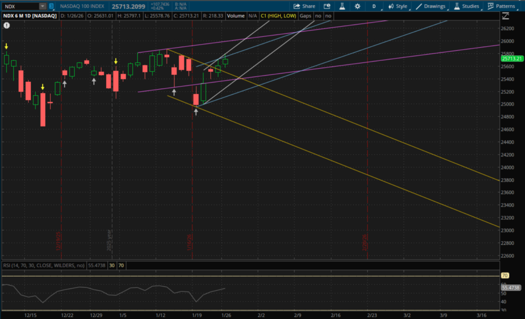 The first resistance to watch tomorrow will be on a retest of today's failed breakout (blue) which will be just below 25,800 which is also right around today's high of 25,795.10. If it breaks through the retest, then the next resistance level to watch will be from the new uptrend (white) that it started today which will be around 25,885. On a pullback tomorrow, the first support would be around 25,460 from the prior daily downtrend (yellow). After that, there would be more support at about 25,390 (purple) and then the new uptrend support (white) would be at about 25,345 - however it may take a couple of days to get back to the bottom of this new range in which case that support would be higher later in the week.