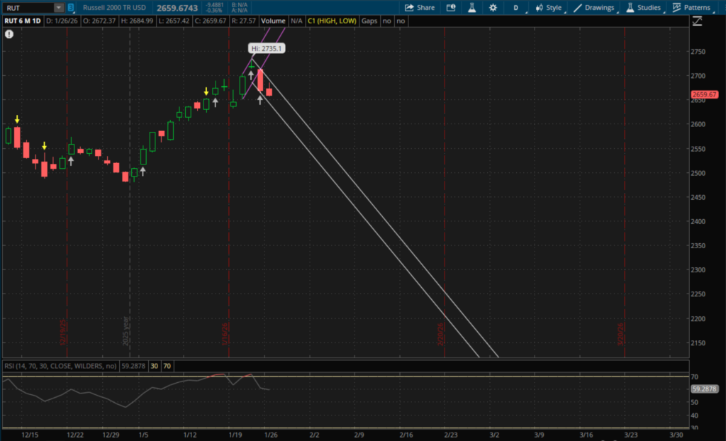 With the late day sell off in markets today, the Nasdaq did have a failed breakout on the daily. In Friday's update I mentioned that the 25,750 level was the key daily resistance to watch which it actually got rejected at this morning on its initial breakout attempt. It did break through it later in the day on its second test, but it failed to close above it which now gives it that failed breakout. Since it did put in a higher high, it still starts a new uptrend going into tomorrow. But its already at the top of this new range and the uptrend that it failed to close above will also act as resistance on a retest tomorrow. So there is risk of a pullback again here.