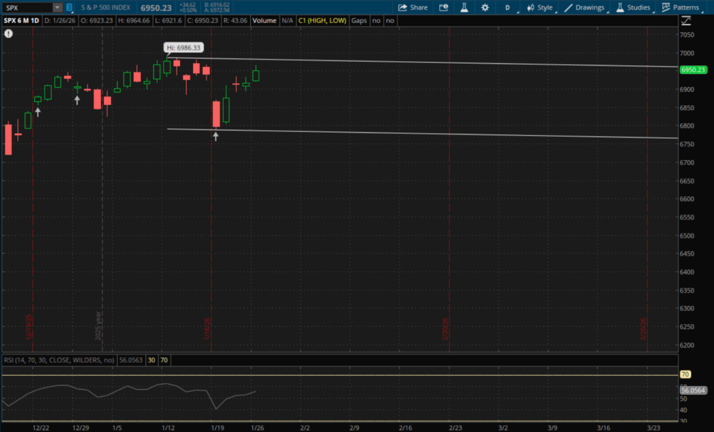The S&P broke and closed above its prior uptrend resistance around 6,935 that I mentioned in Friday's update. Now this trend is no longer valid and for now it trades in a single sideways trend. That resistance remains at about 6,980-6,985, but it also has weekly resistance (see this weekend's update) at about 6,970-6,975 which it did not break through this morning. So this area between 6,970-6,985 where both the daily and weekly resistances sit will be a big area to watch this week.