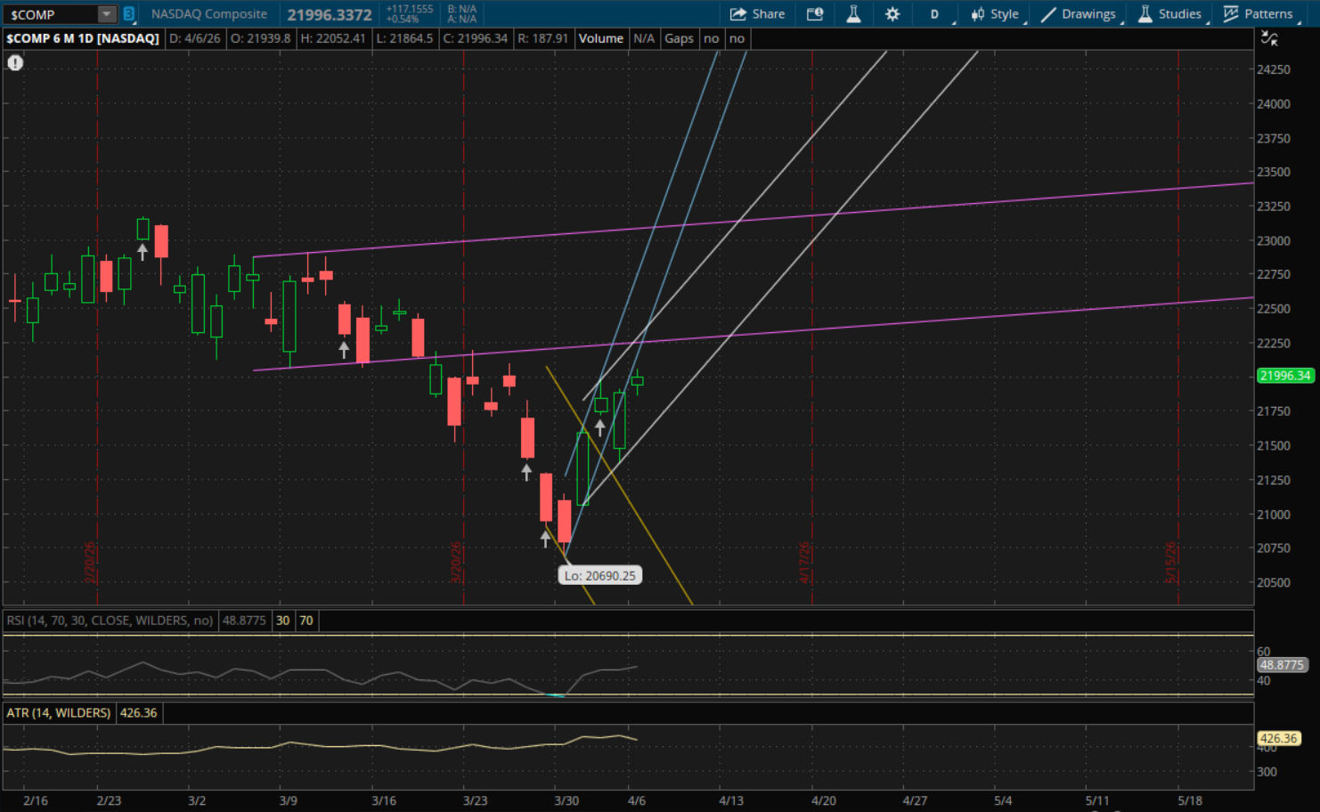 It was a relatively quiet session and volumes were very light. The Nasdaq did not break through any support/resistance levels so nothing changes from the previous daily update. For tomorrow the next resistance level to watch will be at about 22,260 from its prior uptrend (purple). If it can break through this level then its primary uptrend (white) would be the next level to watch at 22,440-22,450. On a pullback, this same primary uptrend will be support at 21,680-21,685. For now that's the only daily support level to watch.