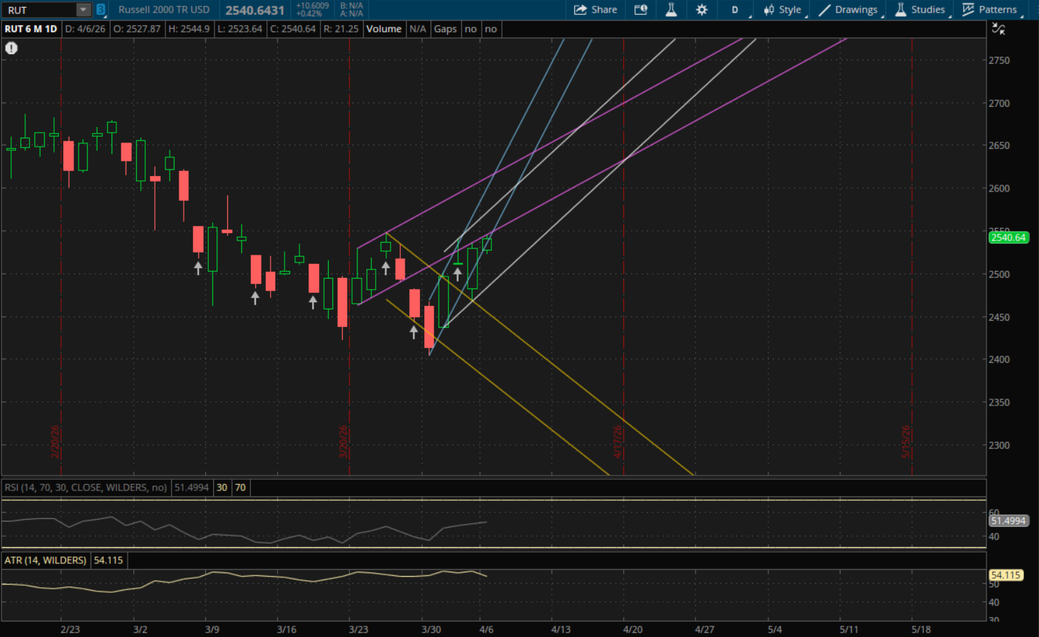 The Russell 2000 also remained in its primary range today so it also does not start any new ranges for tomorrow. It did get rejected at its prior uptrend (purple) again today, just like it did on Thursday. This will be the first key resistance to watch again tomorrow and it'll be at 2,555. If it can break through it this time, then its next uptrend (blue) would be resistance at 2,568. Lastly, its primary uptrend (white) would be resistance at 2,587. On a pullback, its primary uptrend (white) would be the first support to watch and that level will be right around 2,500. After that, its only other support would be from its prior downtrend (yellow) at about 2,442 if we get a larger sell-off.