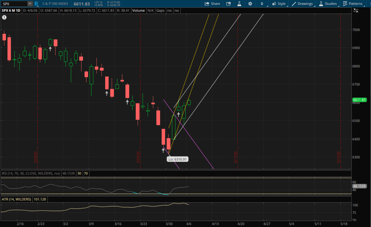 The S&P also did not break through any support/resistance levels today so it doesn't start any new ranges either. The next resistance to watch will be from its prior uptrend (yellow) at 6,710 followed by its primary uptrend (white) at 6,727. On a pullback, its primary uptrend would be the first support to watch at 6,555. If that doesn't hold and there's a larger sell-off then its prior downtrend (purple) would be the next support at about 6,380.