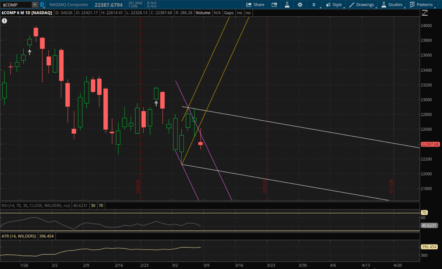 Looking at levels for Monday, the Nasdaq broke and closed below its prior uptrend support and now starts a new daily downtrend. Its prior downtrend (purple) will be the first level to watch which will be at about 22,340 for Monday. The Nasdaq closed at 22,387 yesterday, so it's currently above it. But with the current volatility in markets it could very easily open below this level in which case it will be resistance. If it does open above the 22,340 level then it will act as support on a pullback. The next resistance level on a rally would then be at about 22,850 from its new primary downtrend (white). Its prior uptrend (yellow) would also be resistance just above that at about 22,880.
