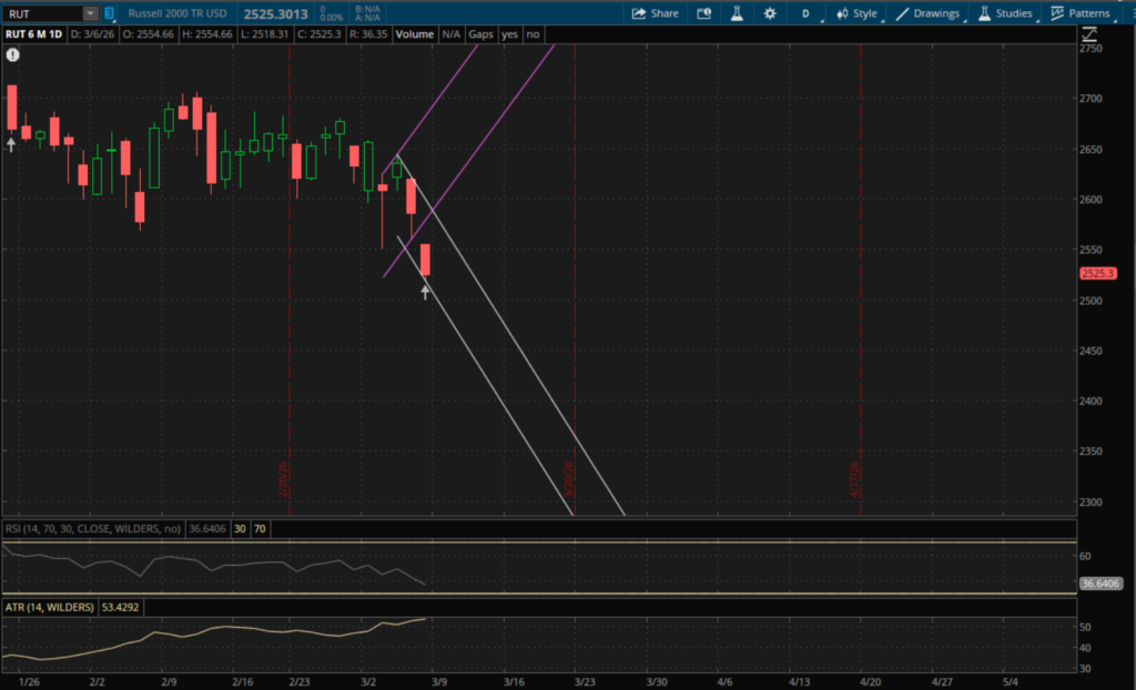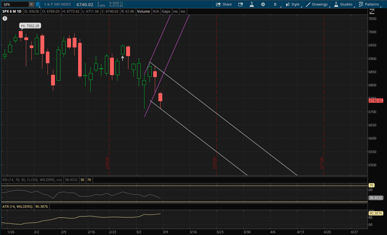 The S&P also started a new downtrend yesterday after it broke and closed below its prior uptrend support. The difference here is that it's already at the bottom of this new range. But it can still go lower to test the support again on Monday which will be at about 6,695. It closed at 6,740 yesterday and there is still risk of a gap below this 6,695 level on Monday due to the elevated volatility. If that happens, then 6,695 will become resistance on a bounce. On a rally attempt the next resistance to watch would also be from this new downtrend (white) at about 6,840 with more resistance from its prior uptrend (purple) at about 6,860-6,865.