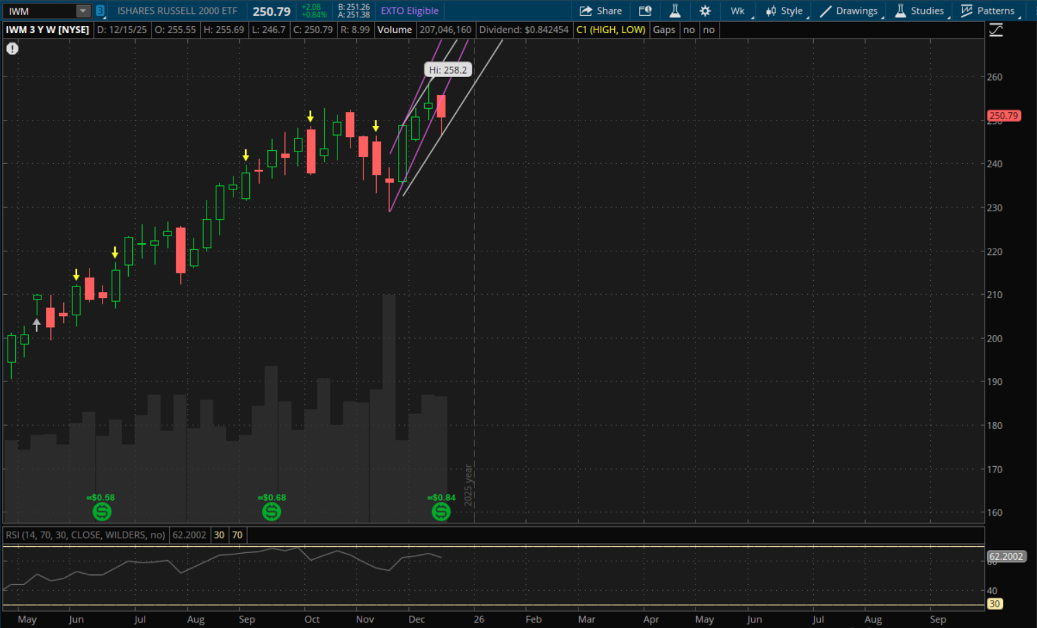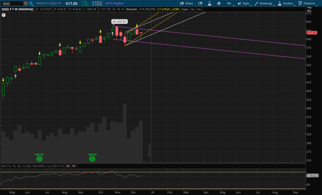 There was some technical damage done with last week's pullback, even with the rally back into the end of the week. IWM and SPY both closed below their weekly uptrend supports while QQQ finished the strongest and managed to close back above its primary weekly uptrend support, putting in a failed breakdown. Starting with IWM, which had the weakest weekly close, still starts a new weekly uptrend. However, there is risk of opening below that new uptrend support which is at about $251.50. Given that IWM closed at $250.79, it would need to gap up on Monday above that $251.50 area to remain in the new uptrend. Otherwise, that level will be resistance. It's still possible that it breaks above that $251.50 area even if it opens below it, but downside risk increases when there's an open below support. If it closes the week below $251.50 then a new weekly downtrend would start going into 2026.