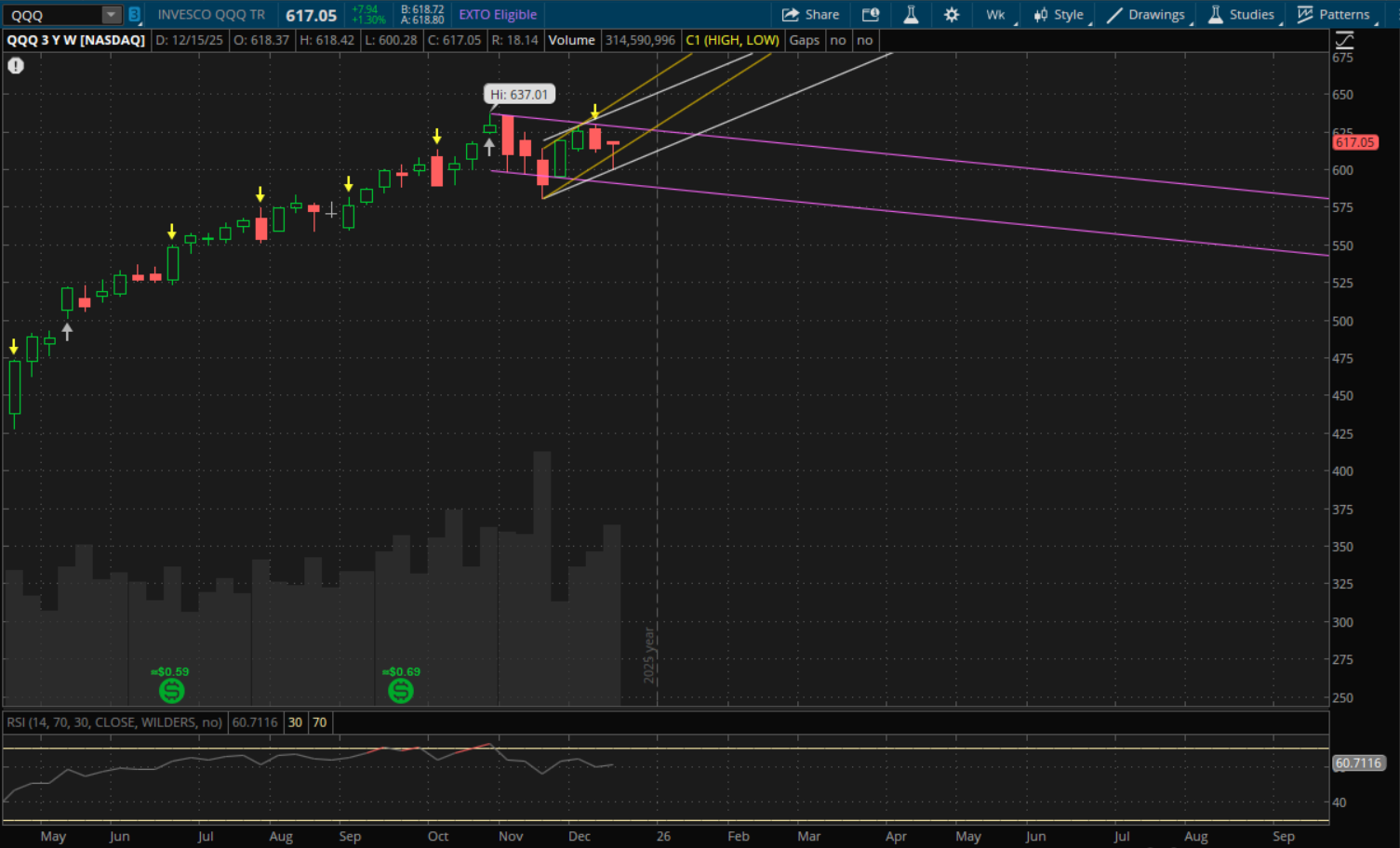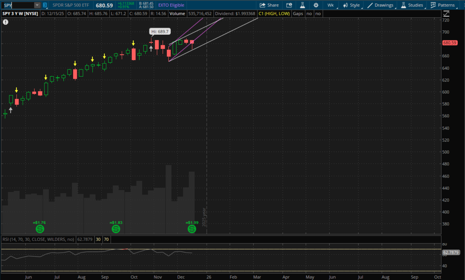 Lastly for SPY, similar to IWM, it closed below its previous uptrend support but still starts a new weekly uptrend. That new uptrend support is around $674.50 so there's very little risk of it gapping below it given that it closed at $680.59. The prior uptrend which it closed below last week will now act as resistance which will be at about $691.50 next week.