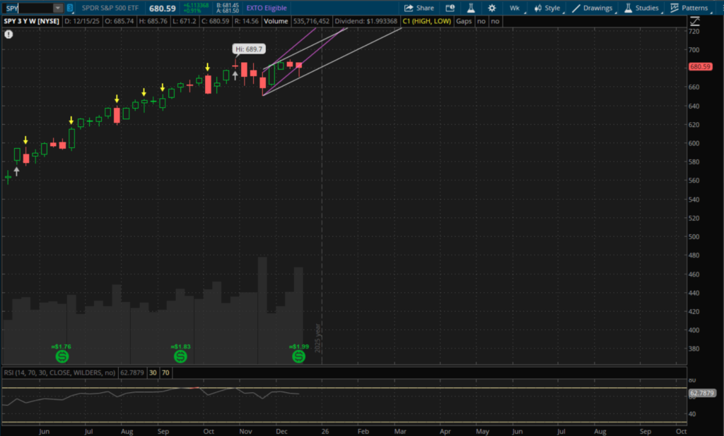 The markets staged a late rally back this week after strong earnings from MU and the delayed November CPI report came in cooler than expected as well as a resurgence in the AI trade on Friday. Next week is a short trading week with the markets closing early (1pm Eastern) on Wednesday for Christmas Eve and they will be closed all day on Thursday for Christmas with regular hours resuming on Friday, December 26th. So expect some light volume holiday trading. But next week is also when the 'Santa Rally' phenomenon comes into play, with Wednesday being the start of it.