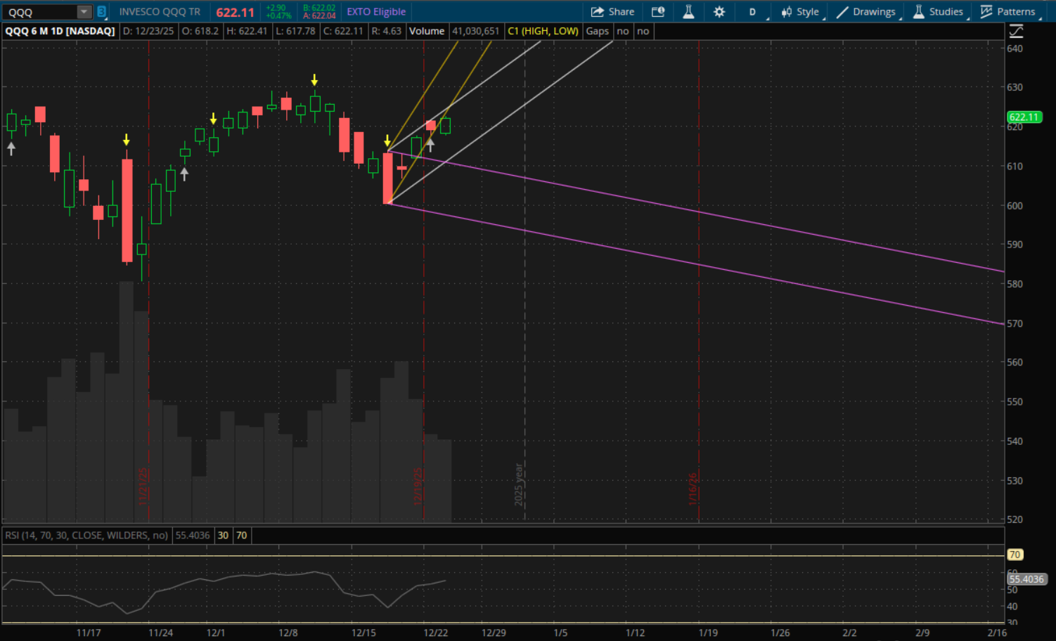 QQQ opened below its daily uptrend support from yesterday but did finish strong and it still starts a new uptrend here (white channel). There may be room to pull back in this uptrend, but it still wouldn't be any cause for concern right now.