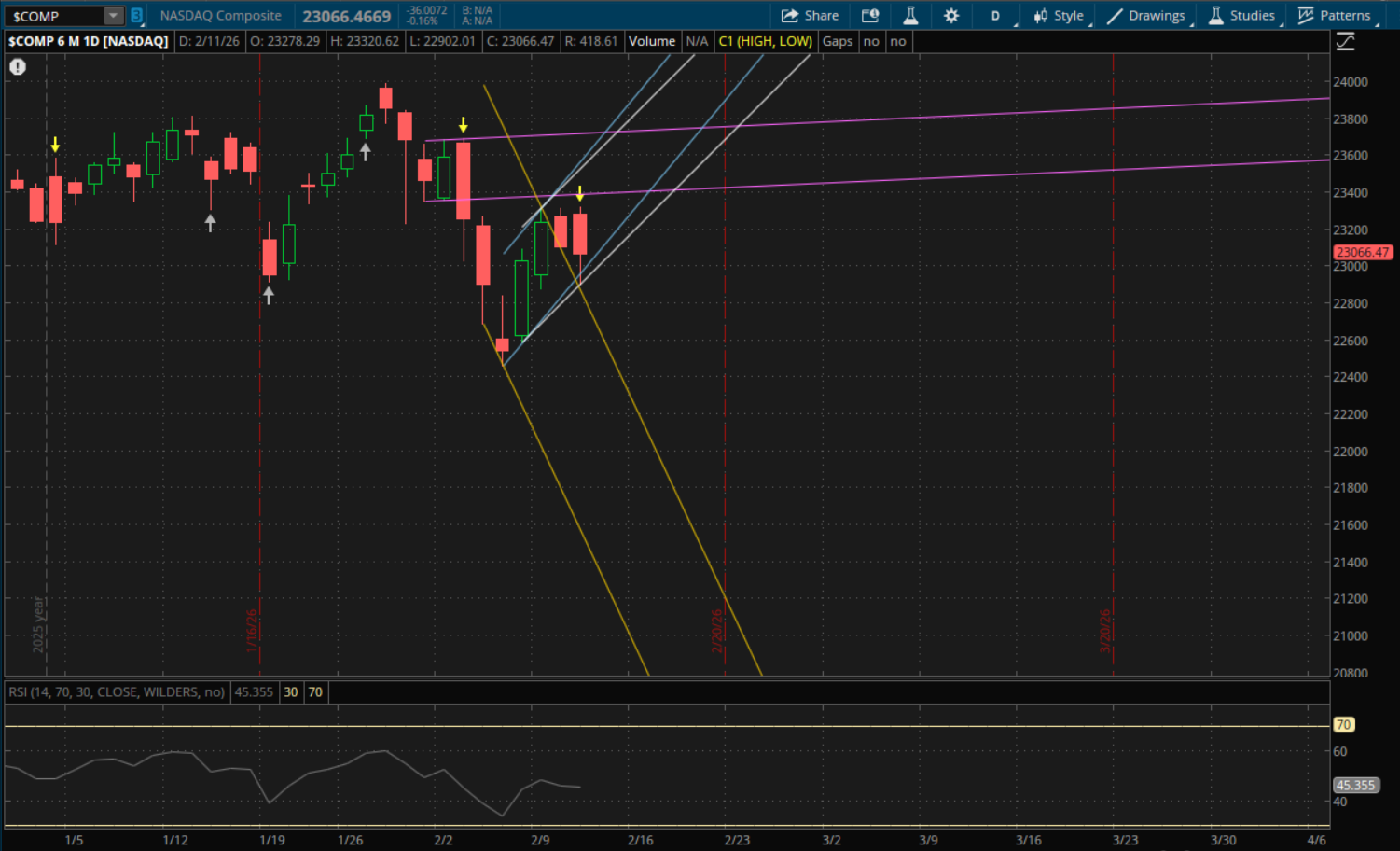 All of the indexes broke through their primary uptrend supports today on daily time frames, but they all also rallied back to close above them and put in failed breakdowns. However it wasn't a strong finish. Looking at the Nasdaq for tomorrow, the first key level to watch will be at 23,090 which will be the retest of today's failed breakdown (blue). It closed at 23,066, so it will need to gap up a little tomorrow in order for this retest to be support. If it fails to gap above it, then it will be resistance. After that, the next support would be from the new uptrend it started today (white) which will be right around 23,000. If that does not hold, then its next support will be from the prior downtrend (yellow) at 22,640. Resistance to watch remains the same from its prior sideways trend (purple) which is just under 23,400 again.