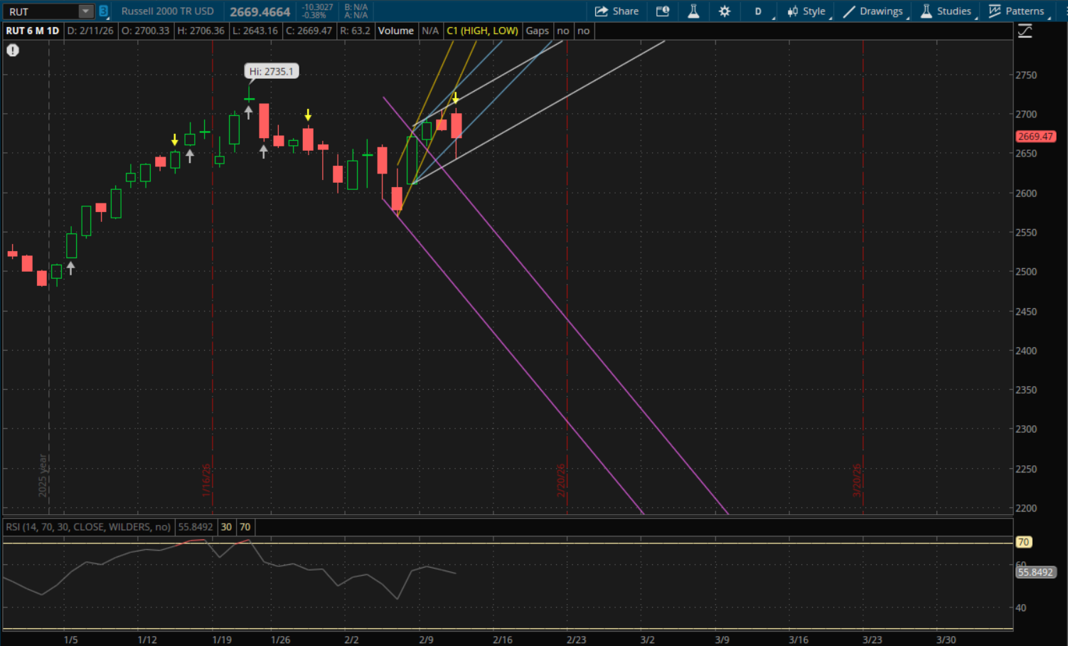 Similarly, the S&P put in a failed breakdown but it wasn't a strong finish and tomorrow it will need to gap above 6,964 to hold the retest of today's failed breakdown (blue). This would require a larger gap up of about 0.3% as it finished at 6,941 today. If it fails to get that gap up, then the 6,964 level becomes resistance on a rally attempt. The next support to watch would be from its new uptrend that it started today (white) and that will be at about 6,944 - which it also closed below today. So if it fails to open above this level, then that will also be resistance. If we do get a breakdown tomorrow then the next supports to watch would be around 6,830 from its prior downtrends (purple) followed by 6,780 (yellow). Meanwhile, daily resistance is pretty far and unlikely to come into play, but the next big resistance level I'm watching is still on the weekly time frame at 7,060-7,065.