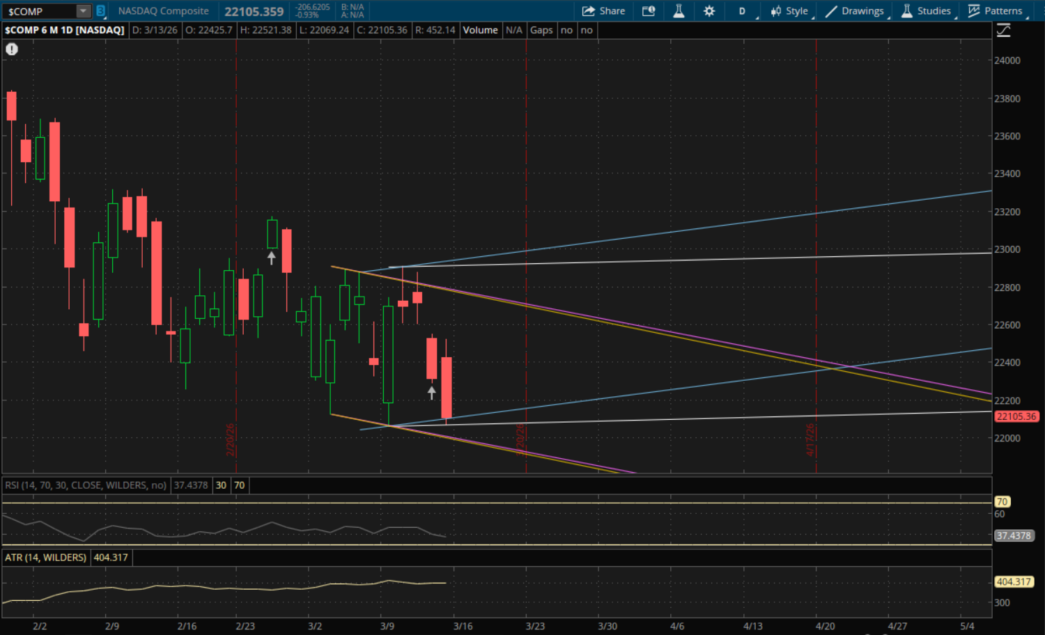 If we get a rally going on Monday then the next resistance levels to watch will also be from those same prior downtrends (purple and yellow) at 22,765-22,775 followed by its new range (white) at 22,910 and lastly its prior uptrend (blue) at 22,925. These levels are pretty far away but they are within reach given the current volatility in markets.