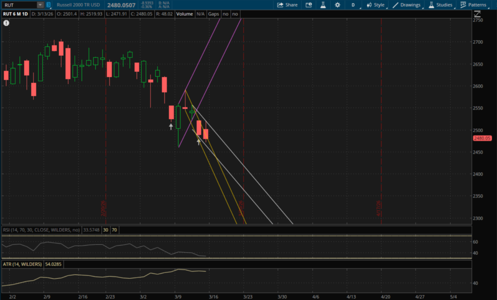 The S&P did not break through its primary downtrend from the prior update so it doesn't start any new daily trends going into Monday's session. The markets did have an early rally attempt yesterday with the S&P nearly testing its primary downtrend (white) which is where I entered short yesterday and took profits on the way down. It also begin to break through its prior downtrend (purple) into the close but it was an insignificant break so this trend remains valid for now.