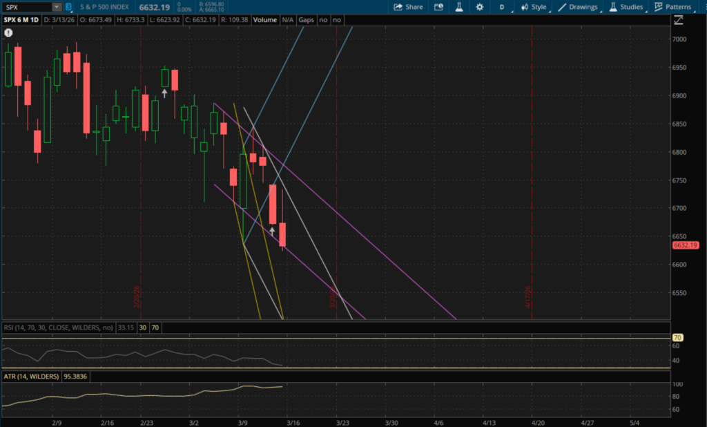 That downtrend (purple) will be the first level to watch on Monday which will be at about 6,618 which the S&P is above as of Friday's close at 6,632. If it opens above it, then it will remain as support and if it gaps below it then it will be resistance. That's really the only support to watch for now as its primary downtrend will be very far and it's unlikely it gets tested. On a bounce, the first resistance to watch will be from that primary downtrend (white) at about 6,708. If it can break through that then there would be more resistance from its prior downtrend (purple) again at 6,760.