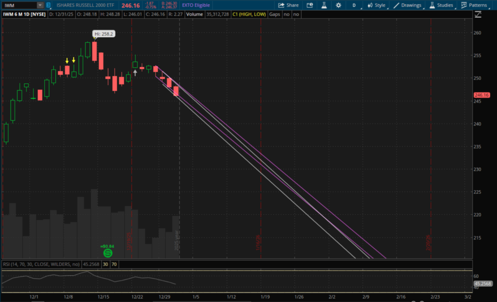 On daily time frames, IWM started another downtrend yesterday with support around $246.60 but it failed to hold it again and also closed below it at $246.16. This starts another downtrend for it going into Friday (markets are closed tomorrow for New Year's) with the first support at about $245.35 from its prior downtrend (purple channel). Assuming we don't gap below that, then that level will act as support. If it doesn't hold, then the next daily support to watch will be at about $244.65 from the new daily downtrend. As I've been mentioning in previous updates, small caps have been breaking down and it's virtually a guarantee that it closes below $254 weekly support on Friday to start a new weekly downtrend going into next week.