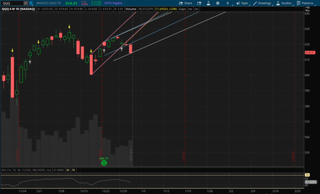 The markets continued lower again on the final trading day of the year and this time it wasn't just small caps. IWM did close down 0.75%, but QQQ led the way lower today with it finishing down 0.83%. SPY also finally saw some real weakness with it losing 0.74%. The VIX finished up 4.3%, just below $15. Meanwhile metals took another hit with Silver falling nearly 9% and Gold down 1.25%. Bitcoin was pretty flat but did log another negative month.