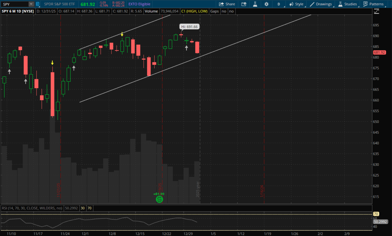 SPY finally saw some weakness today and is now pretty close to its daily uptrend support which will be at about $680.70 for Friday. Weekly support is also pretty close around $679.25. For now SPY remains in the same single daily uptrend that it has been in all month. That won't change until it breaks through it one way.