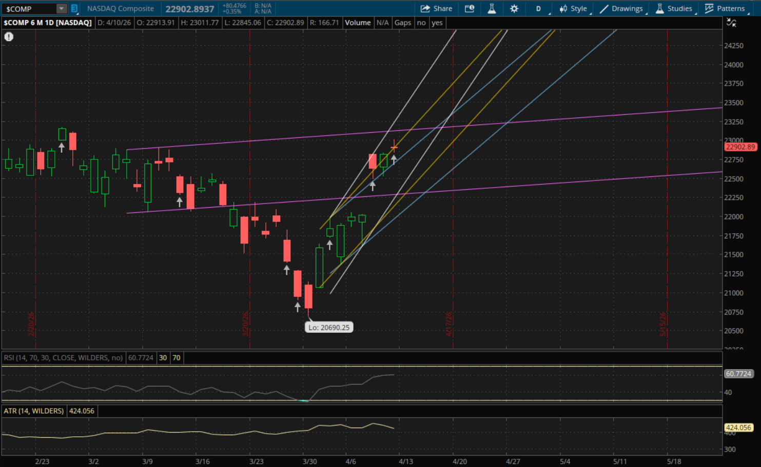 If we get a pullback on Monday, the first support to watch will be at 22,825 from its prior uptrend (blue) and then if there is a big sell-off its primary uptrend (white) would come into play at 22,450.