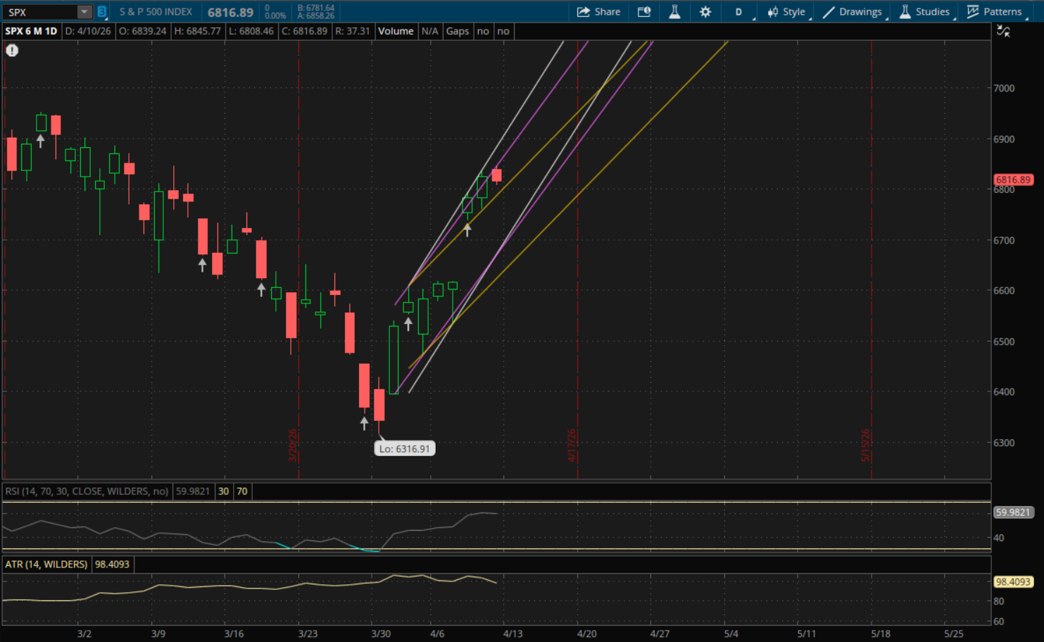 If we get a pullback and gap or break below the first key level (yellow) at 6,818-6,819 then the next support will be at 6,720 from its primary uptrend (white). Its prior uptrend (purple) will be the next support just below that at 6,712-6,713. So this 6710-6,720 area would be big support from both of these trends.