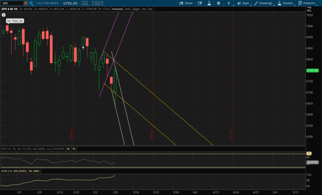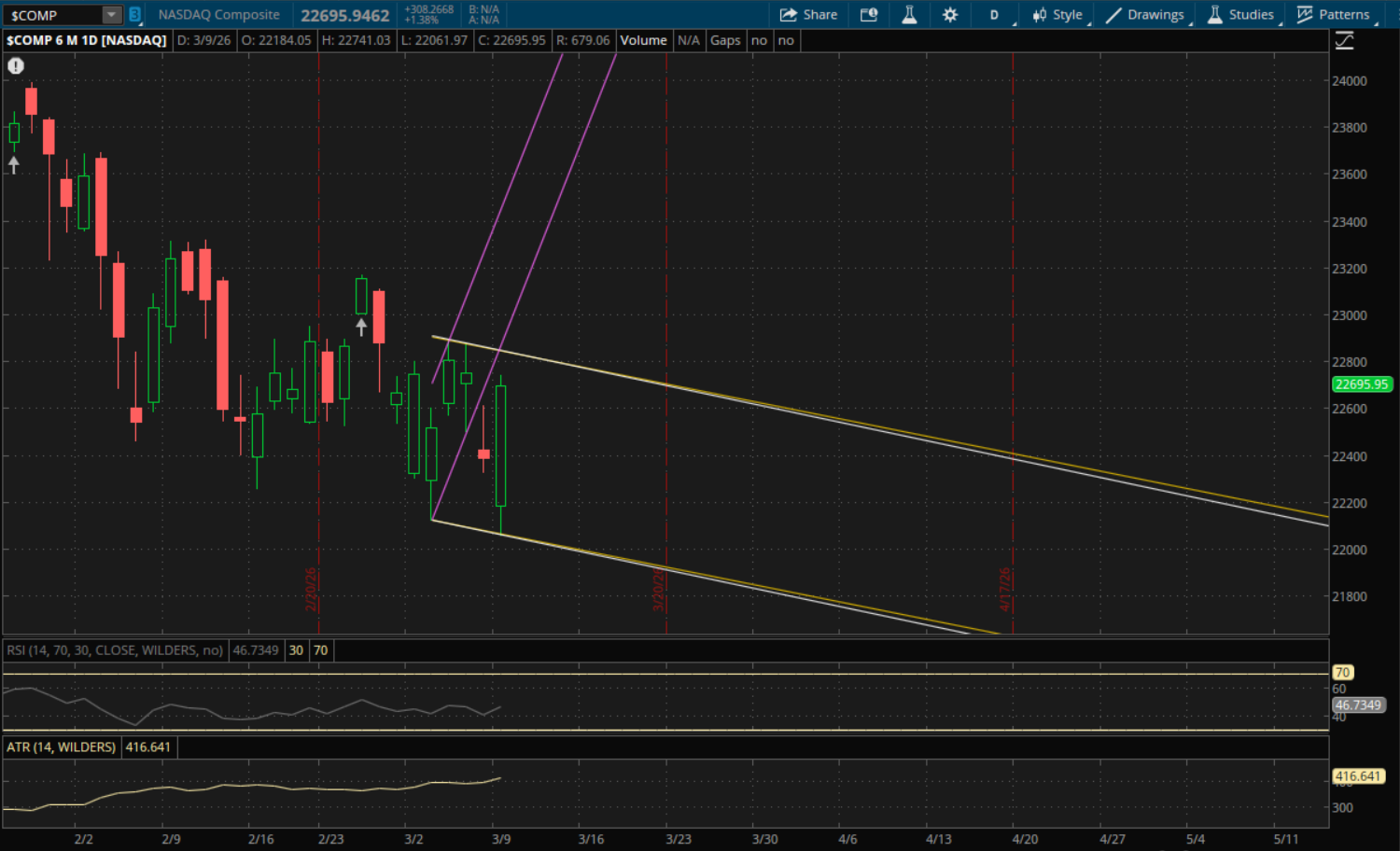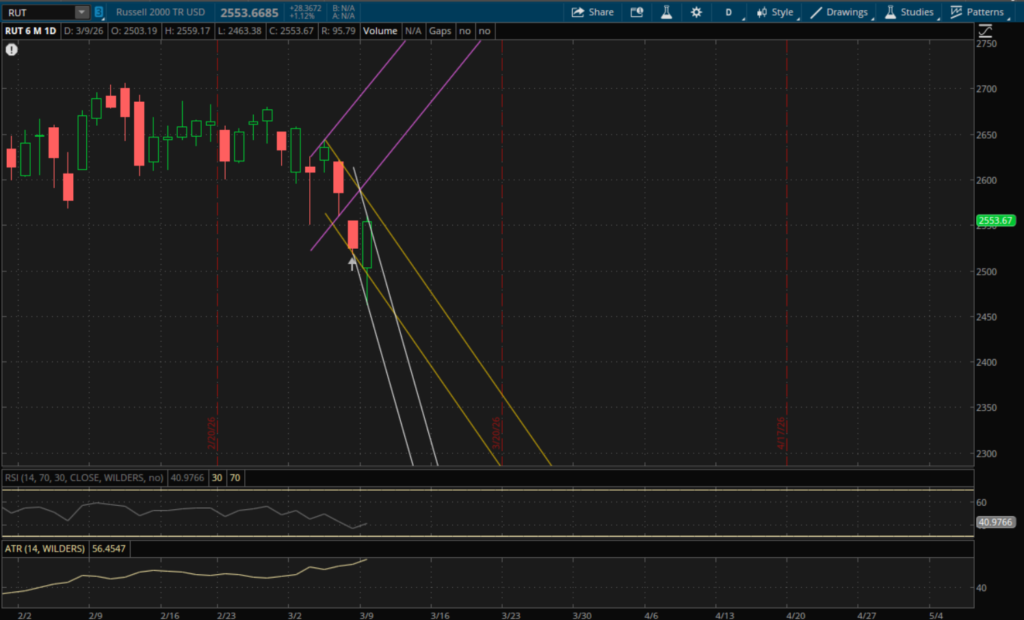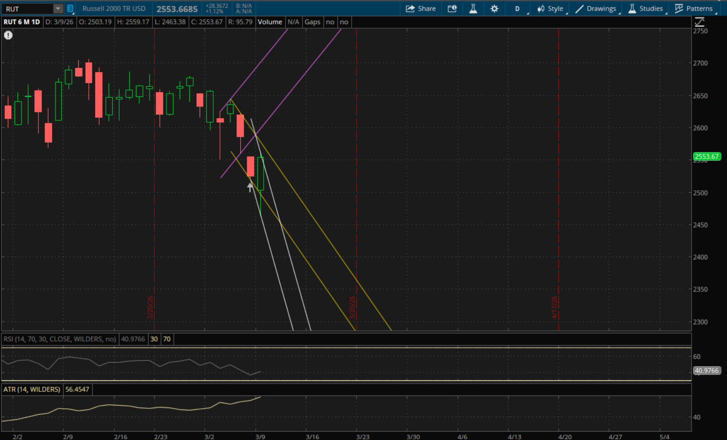 Futures were looking bleak last night as the war with Iran appeared to be escalating. Oil rallied over 30% overnight, adding to last week's gain of 37% which was its biggest weekly gain in history. Index futures were diving with the Russell 2000 (RTY_F) down 4% as future rate cuts were looking less and less likely. But, futures did recover some by this morning's market open. They were still down, but it wasn't as bad. Late in the afternoon, Trump made comments to CBS saying that the war could be over soon and the markets ripped higher on his comments. Oil also reversed sharply and closed the session down 6.4% which was a 29% decline from the overnight highs. Tech led the markets higher with the Nasdaq closing up 1.38%. The 10 year treasury yield also reversed which help boost small caps as the Russell 2000 closed up 1.12%. Meanwhile the S&P posted a gain of 0.83%. The VIX also had a dramatic reversal after hitting a high of $35.30, its highest levels since last year's tariff sell-off. It ended up closing at $25.50, down 13.5% for the day.