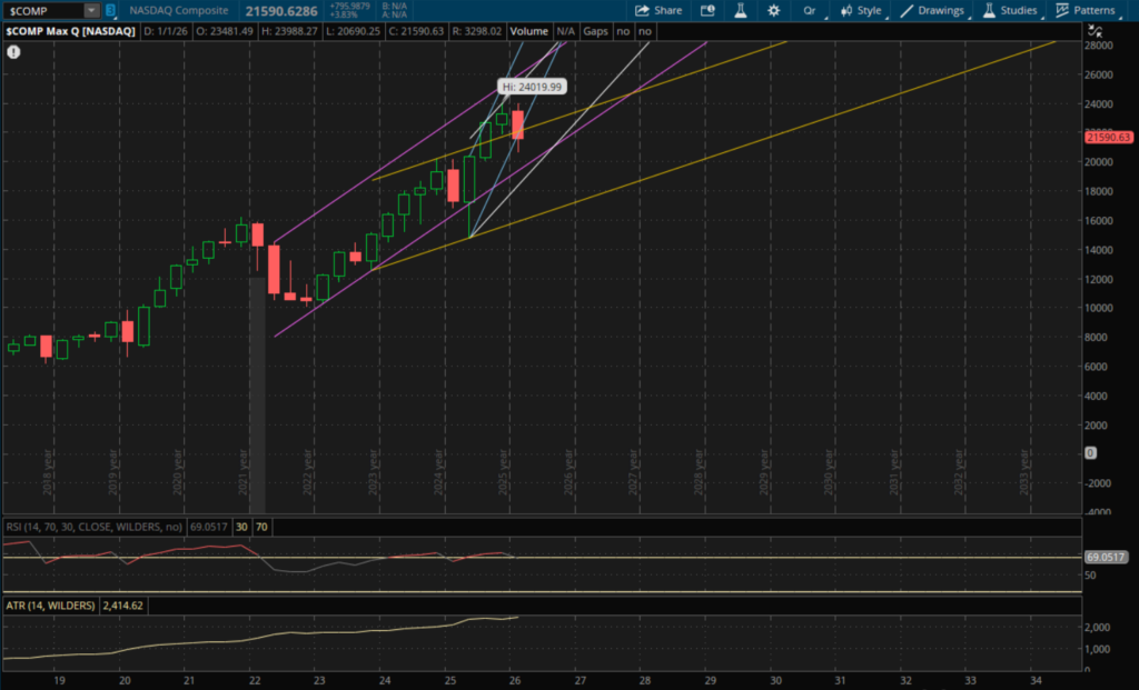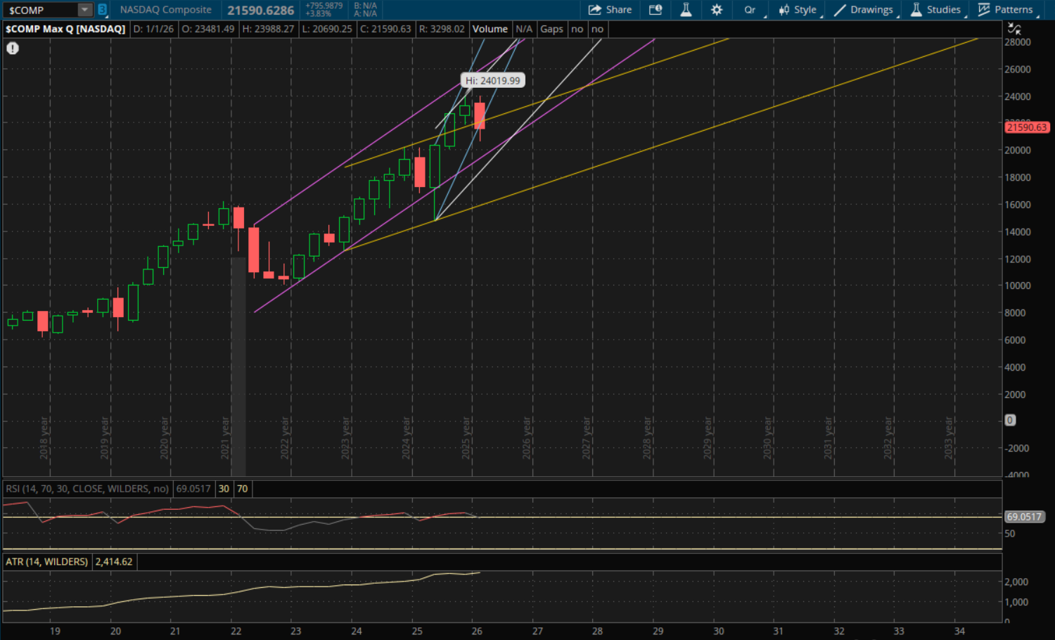 On a quarterly time frame, the Nasdaq closed below last quarter's primary uptrend (blue), but it still starts a new uptrend. There are a few levels to look at here, and the first one is resistance from its prior uptrend (yellow) at about 22,450 on a continued bounce. This level is about 4% away. If it breaks through it and resumes the rally, then the next level to watch would be from its next uptrend (blue) which it closed below today. That resistance would be at about 24,350 which would be new all time highs for it.