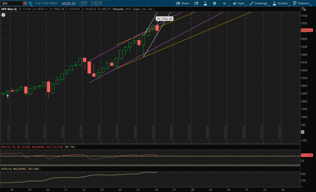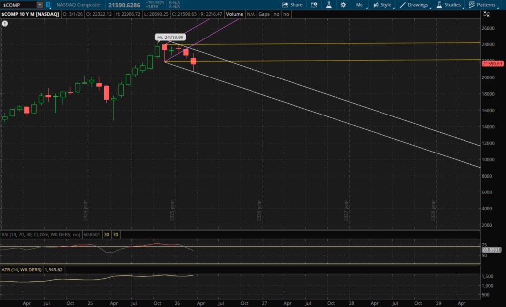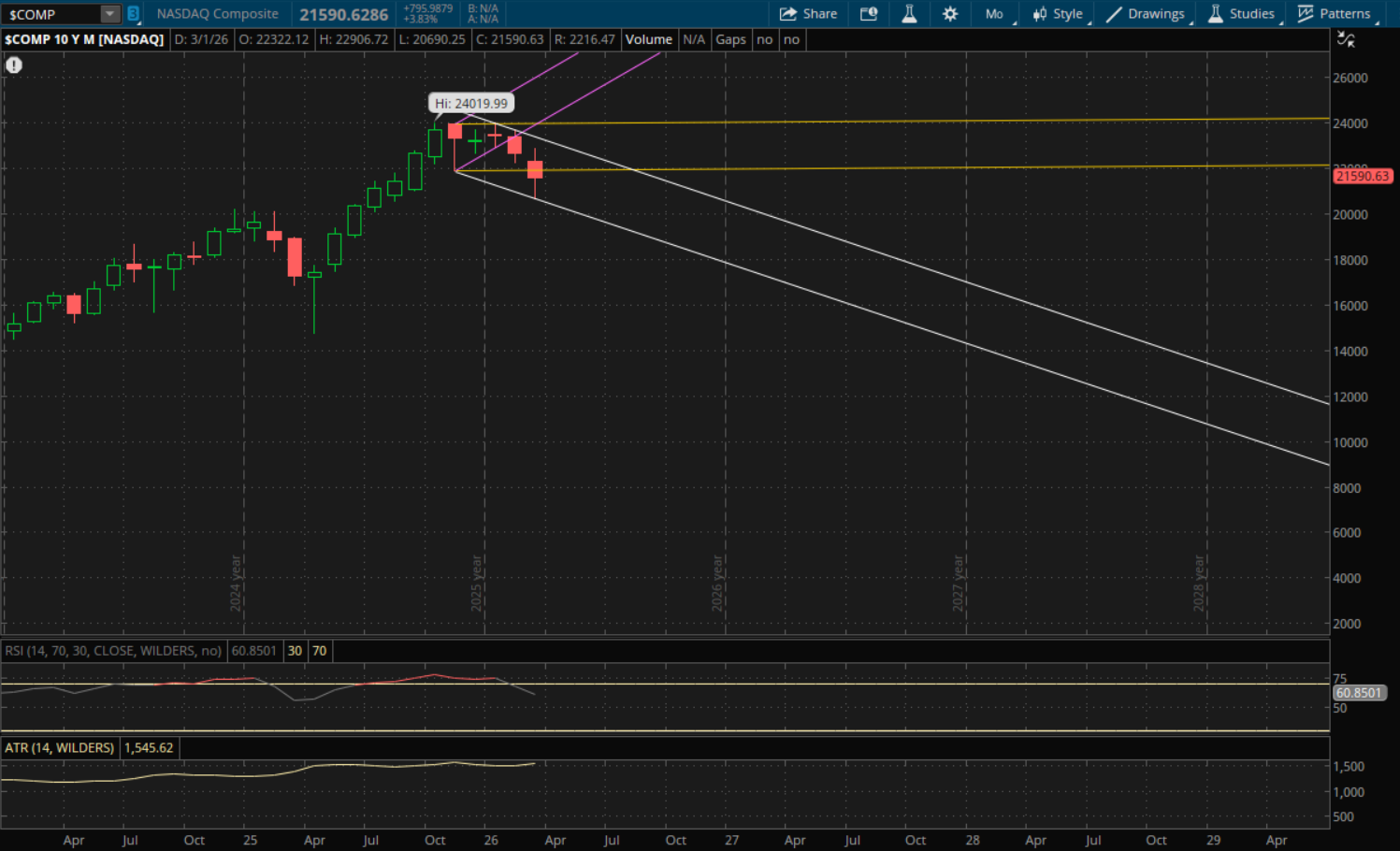 On a quarterly level, the S&P did not break through its primary uptrend. It got very close, but it ended up holding yesterday. However, due to the weak finish it will open below this uptrend to start April which will be at 6,775. That will be the first resistance to watch on a rally which is around 3.8% away. After that, its prior uptrend (yellow) will be resistance at about 6,835 and then its next uptrend (purple) will be at about 7,050 which is new all time highs.