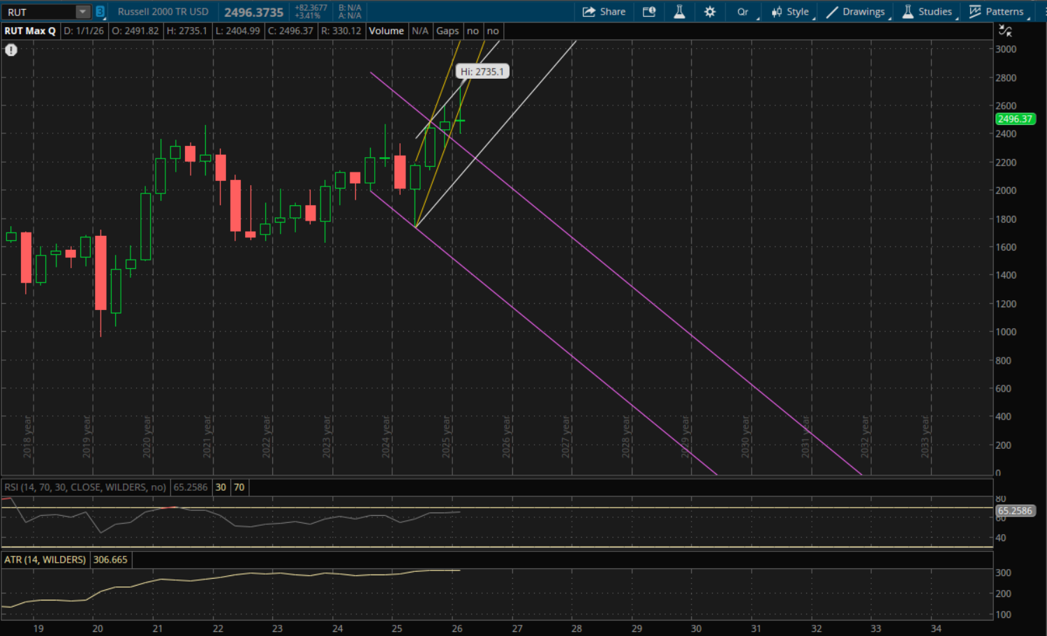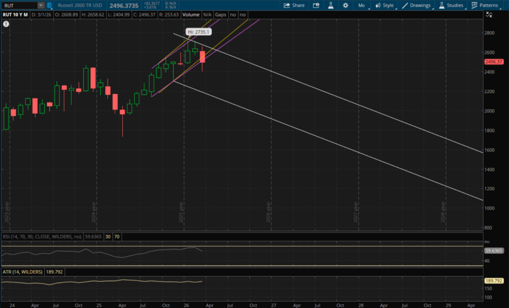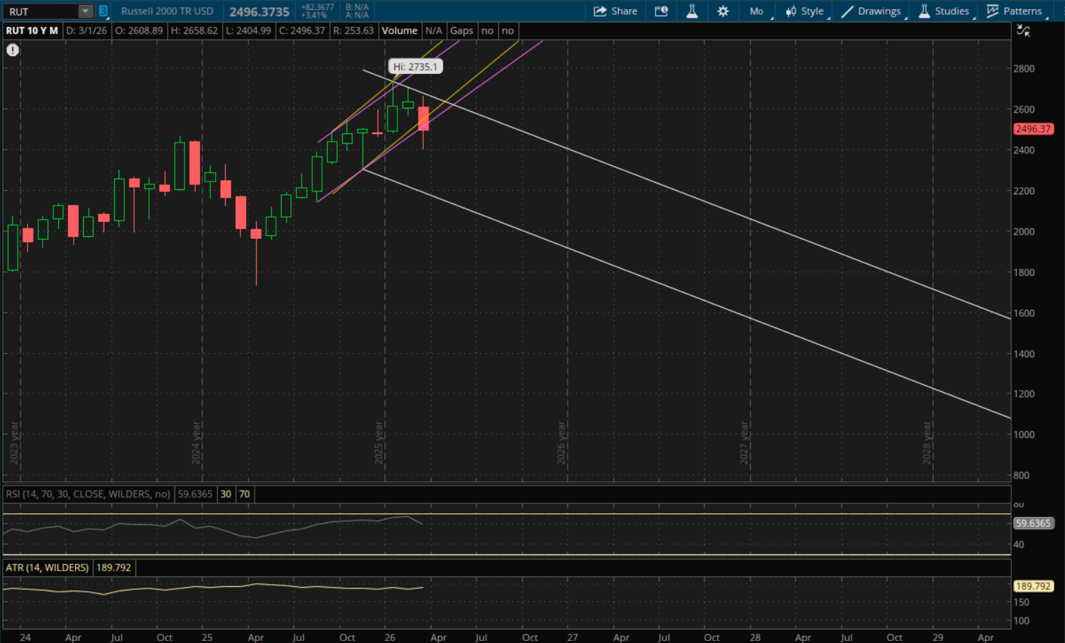 On a quarterly time frame, the Russell closed below its prior uptrend, but still starts a new uptrend going into the 2nd quarter. If the sell-off continues, the next big support level to watch will be around 2,225-2,235 from both its new primary uptrend (white) and its prior downtrend (purple). This area is another 10-11% away and is somewhere I would look to buy if it were to get there. If the rally continues, then its next quarterly resistance will be from its primary uptrend (white) at 2,860 which is above the current all time highs. Its previous uptrend (yellow) would also be resistance at about 2,890.