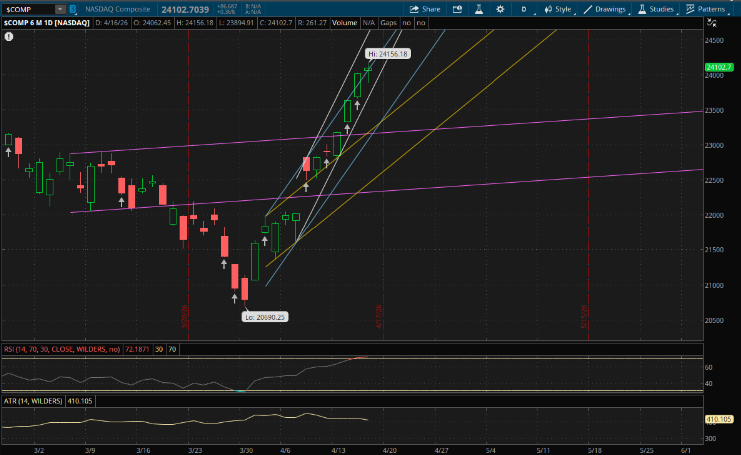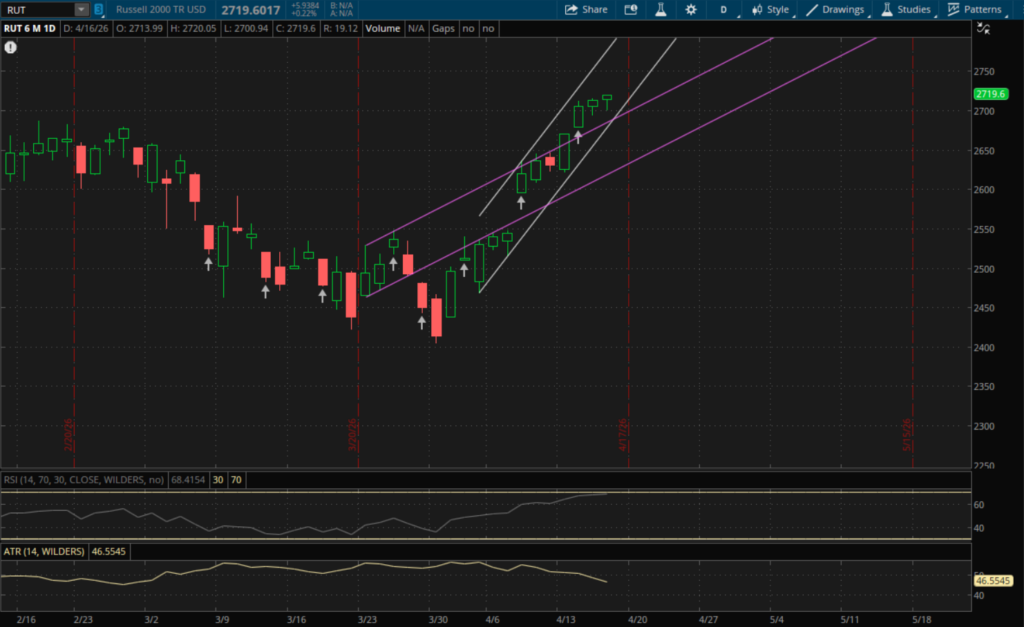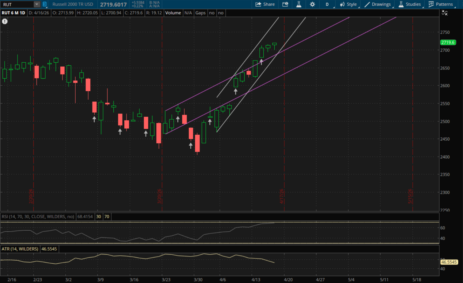 The Russell 2000 hasn't hit new all time highs with the S&P and Nasdaq yet but may get there soon if this rally continues. For now its primary uptrend (white) is going to be the first support to watch at 2,703. If that breaks, its prior uptrend (purple) will be support at 2,695. Its primary uptrend is the only resistance to watch, but it's pretty far away at 2,800 for tomorrow and is unlikely to be tested.