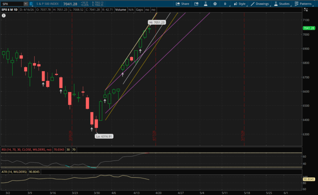 The S&P doesn't start any new ranges either for tomorrow, and the next resistance level to watch will be at 7,115-7,120 from both its prior uptrend (yellow) and its primary uptrend (white). Meanwhile its primary uptrend will also be the next support to watch at 6,976.