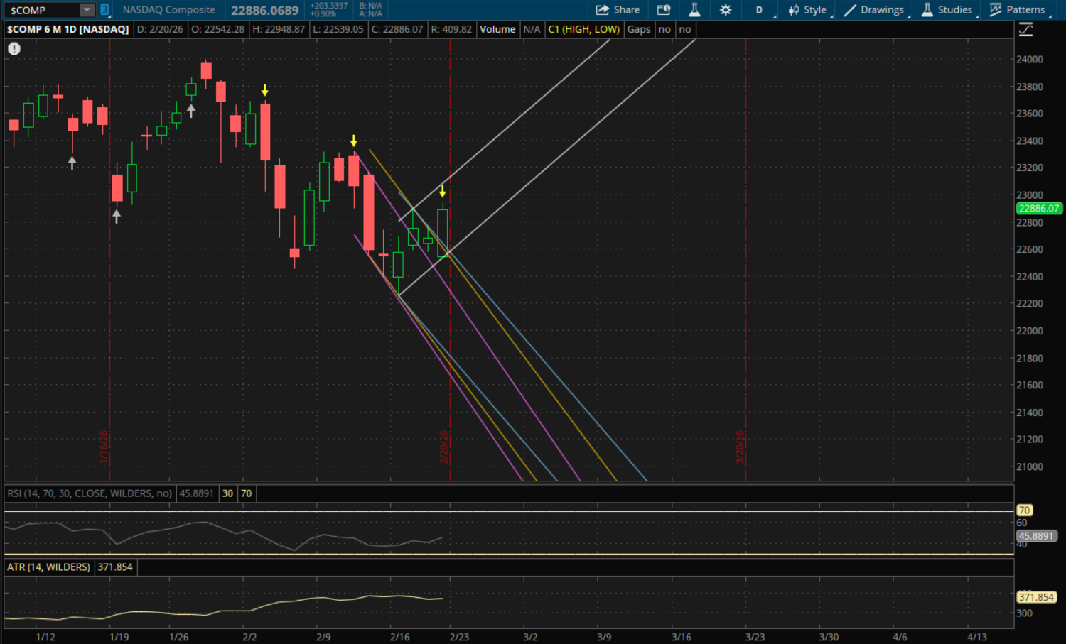 Let's look at the levels for Monday now. Resistance to watch for the Nasdaq will be from its new daily uptrend (white) which will be at about 23,180. The first support to watch if we sell off again will also be from this primary uptrend at about 22,635. If that does not hold, then its prior downtrends will provide support at 22,510 (blue), 22,450 (yellow) and in the event of a big sell-off the next support would be at 22,200 (purple).