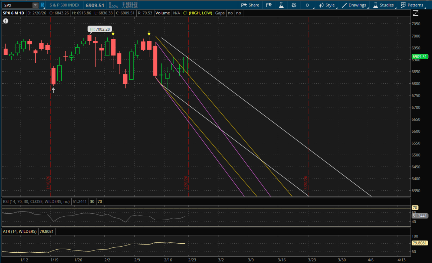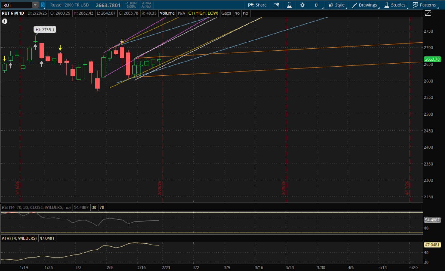 The S&P also broke through its downtrends, but unlike the Nasdaq, it still starts a new daily downtrend going into Monday. But it was a very strong finish near the highs of day, and normally I would say odds are that we open above this new downtrend, but due to the tariff headlines this morning it may throw a wrench into things so we'll just have to wait and see how it opens. But the key support/resistance level to watch from its new primary downtrend (white) will be at about 6,895-6,896. It closed at 6,909 on Friday, so if it does open above the 6,896 level then it will act as support on a retest. If it gaps below it, then it will be resistance on a retest. If it closes above 6,896 on Monday then it will start a new uptrend, and we'll have to wait and see how high it gets for that new trend. Meanwhile, supports on a pullback from its prior downtrends will be at 6,820 (yellow) and then 6,770 (purple) if we were to get a larger sell-off.