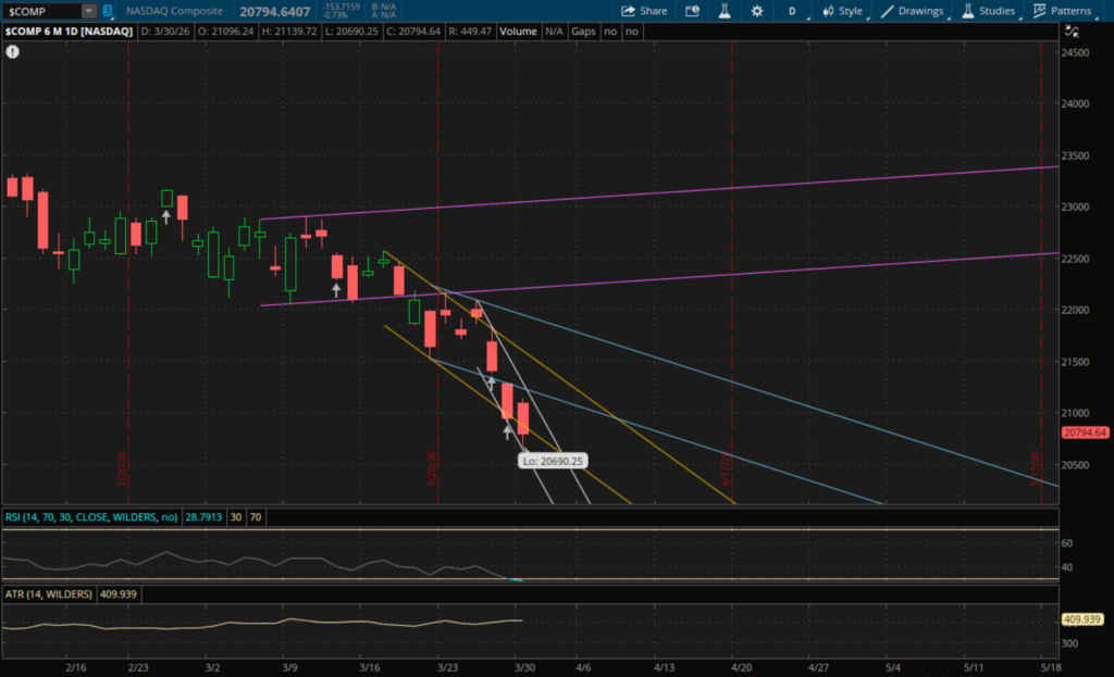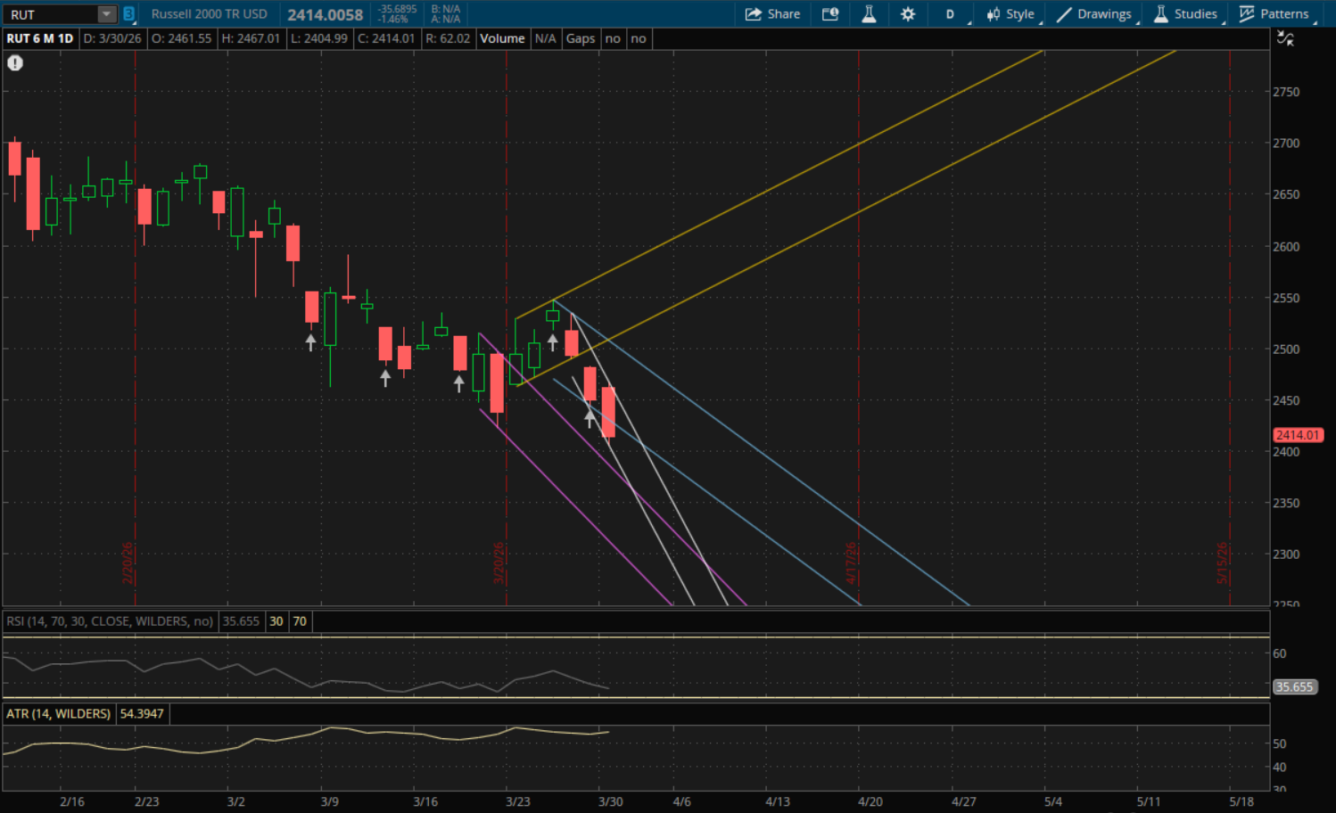 The Russell 2000 broke and closed below its last downtrend support which starts a new downtrend for it going into tomorrow. Its new primary downtrend (white) will be support at 2,372 tomorrow and its prior downtrend (purple) would be support just below that at 2,368. On a bounce, the first resistance to watch will be from its previous downtrend (blue) at 2,416 and then its primary downtrend comes into play again at 2,433. In the event of a big rally back, the next level to watch would be at 2,495 from the top of its blue downtrend.