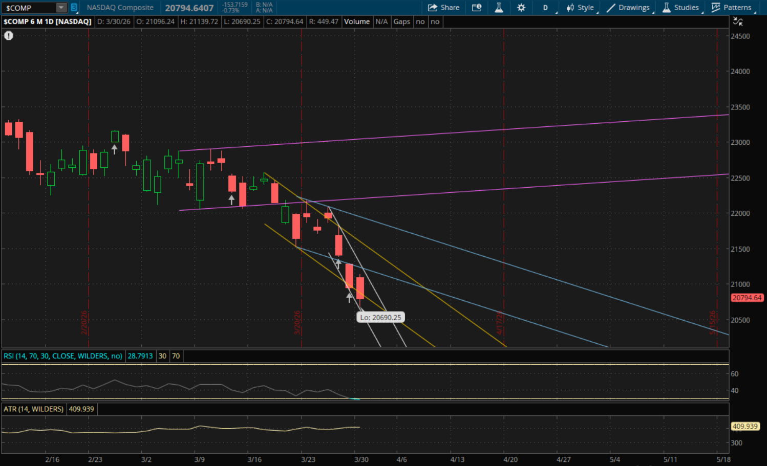 The Nasdaq didn't break through its primary daily downtrend at 20,630 that I mentioned in the previous update, so it doesn't start any new trends for tomorrow. The next daily support to watch is from this same primary downtrend (white) which will now be at about 20,365. That's the only support level to watch for now. If we get a bounce, the first resistance to watch will be from its prior downtrend (yellow) at 20,765 followed by its primary downtrend (white) again right around 21,000. If it can break through this primary downtrend, then it will start a new trend but we'll first have to see how it closes. There will be other resistances above it as well from its prior downtrend (blue) at 21,185 and then its next downtrend (yellow) comes into play again from the top of that range at about 21,500.