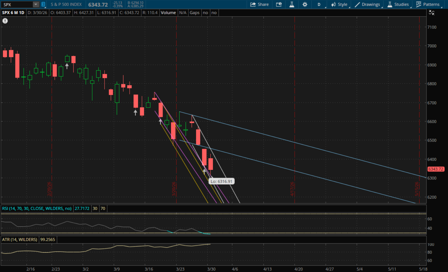 The S&P broke through its primary weekly support today (see the weekly update) at 6,335 before it rallied back to close above it, but we'll have to see how this week finishes to see if it's a failed breakdown or not. It didn't break through its daily supports however, so it also doesn't start any new daily trends going into tomorrow. The first support to watch for tomorrow will be at 6,265 from its prior downtrend (purple) which it bounced off of today. After that, its primary downtrend (white) would be the next support at 6,235. If that does not hold then its next support would be from its prior downtrend (yellow) at 6,205. On a rally attempt the first resistance level to watch will be from its primary downtrend (white) at 6,390. If it breaks through, then the next resistance level would be from its prior downtrend (blue) at 6,445.