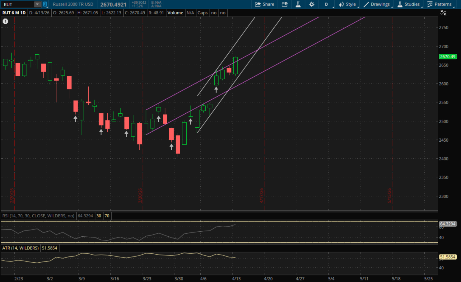 If there is a gap below 2,668 tomorrow, then that level will be resistance on a retest. The next support to watch on a pullback would be from its primary uptrend at 2,633. If that doesn't hold then its last support would be from its purple uptrend again from the bottom of that range which will be right around 2,600.
