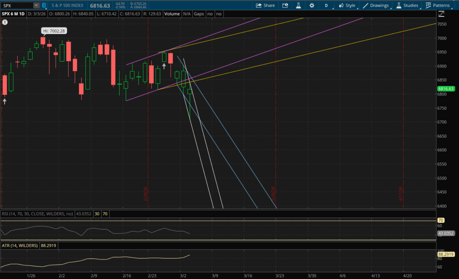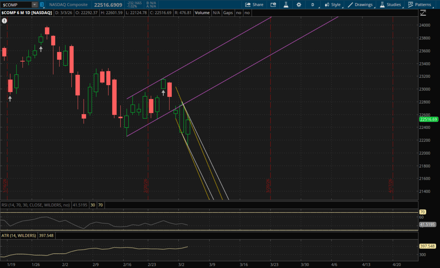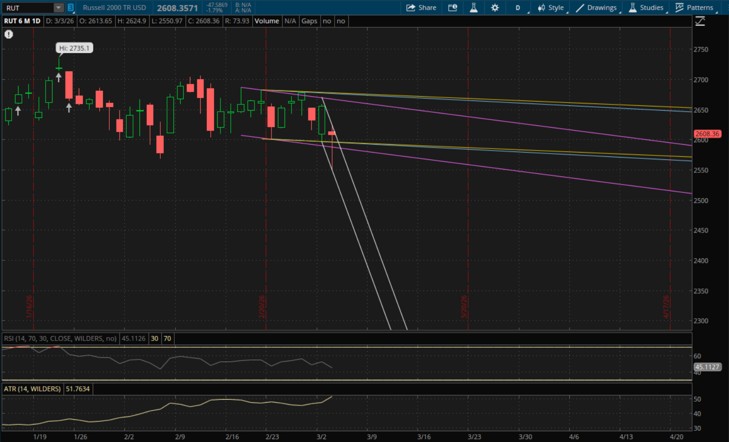 We did get the big gap down this morning to get the Nasdaq and S&P to open below yesterday's primary downtrends, meaning those levels would be resistance rather than act as support on a pullback. The Nasdaq did rally back and break just above that downtrend which was around 22,570, but it failed to close above it. This is another failed breakout which starts a new downtrend. But, it was a strong finish and odds are it opens above it tomorrow. However, just like yesterday when odds were in its favor to open above resistance, we ended up getting a big gap down back under it. With volatility so high right now we could see the same thing happen tomorrow. The first key level to watch will be at about 22,400 from its new primary downtrend (white). It closed at 22,516 today, well above that level, so as long as it doesn't have that big gap down again then that level will act as support on a retest. Its previous downtrend (yellow) would also be support at about 22,335 assuming it does not gap below it. If it does gap or break below these levels, then the next big support will be from its new downtrend again at about 21,900 if we see another big sell-off. And it's prior downtrend (yellow) would be support again just below that at about 21,840. If we do see a breakout to the upside, then the next resistance to watch will be at about 22,850 from the prior uptrend (purple).