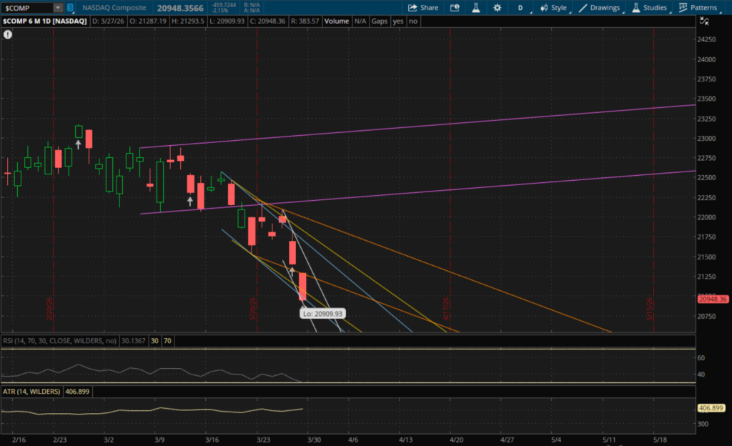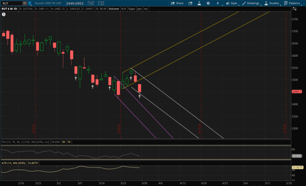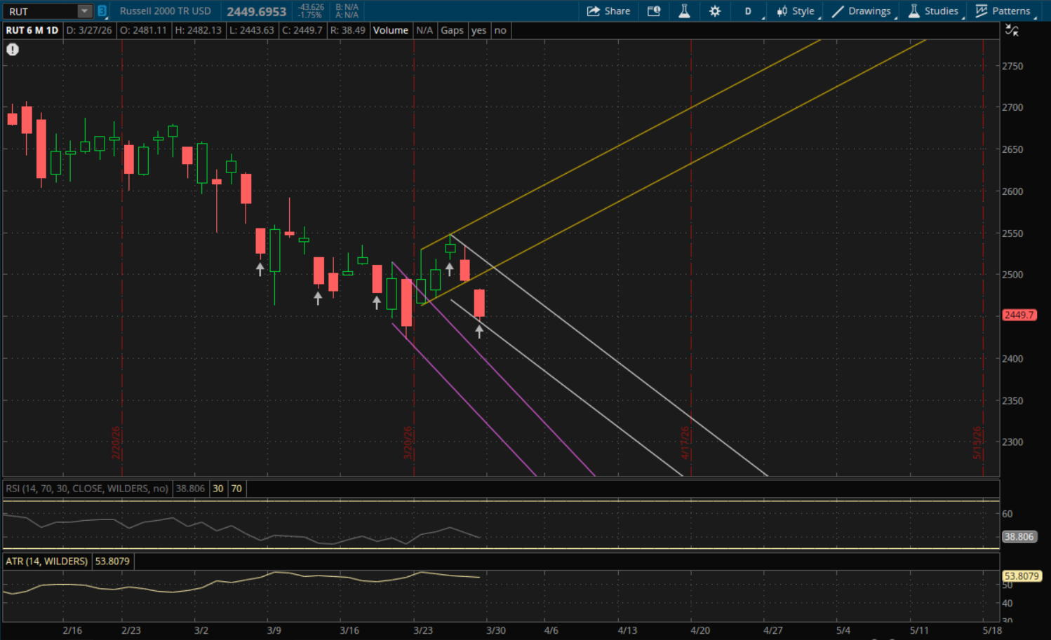 On Thursday after the markets closed, President Trump said that he would be extending the pause on attacking Iran's energy facilities to April 6th. This sent futures higher but they reversed their gains overnight and we got another big gap down yesterday with no let up in the selling as markets finished near their lows of day. The selling was led by tech again with the Nasdaq closing down 2.15% while the Russell 2000 and S&P lost 1.75% and 1.67%, respectively. The VIX closed up 13% at $31.05, which is its highest close since April 21st, 2025 during the tariff induced market sell-off.