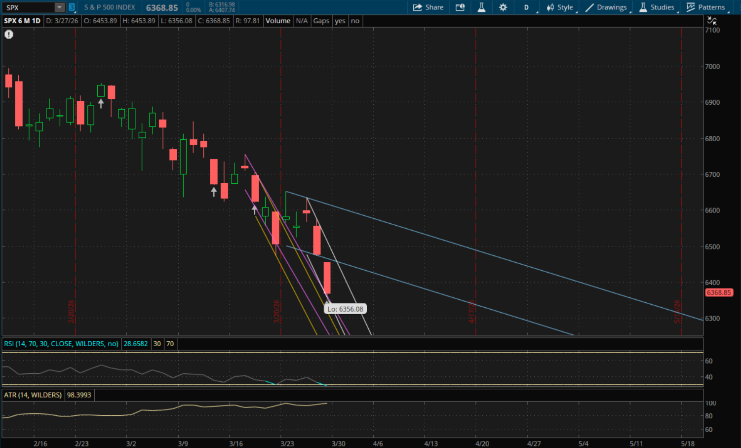 If there's a rally back on Monday the next resistance to watch will be from its new primary downtrend (white) at 6,450. Its prior downtrend (blue) would also be resistance just above that at 6,455.