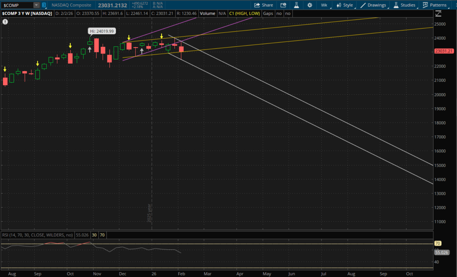 If it fails to open above the key 23,050 level on Monday, then that will be resistance on a retest. Then the next support to watch will be from its new downtrend (white) at about 22,235. If that does not hold either, then it will start a new downtrend going into the following week but we will need to see how it closes to determine whether it's a confirmed breakdown or failed breakdown.
