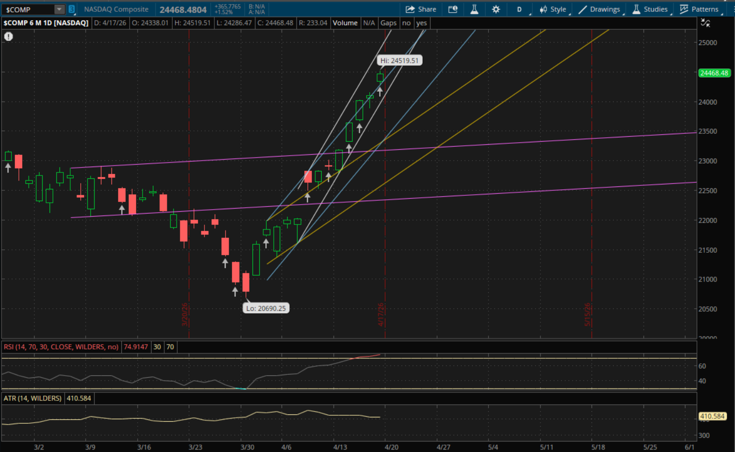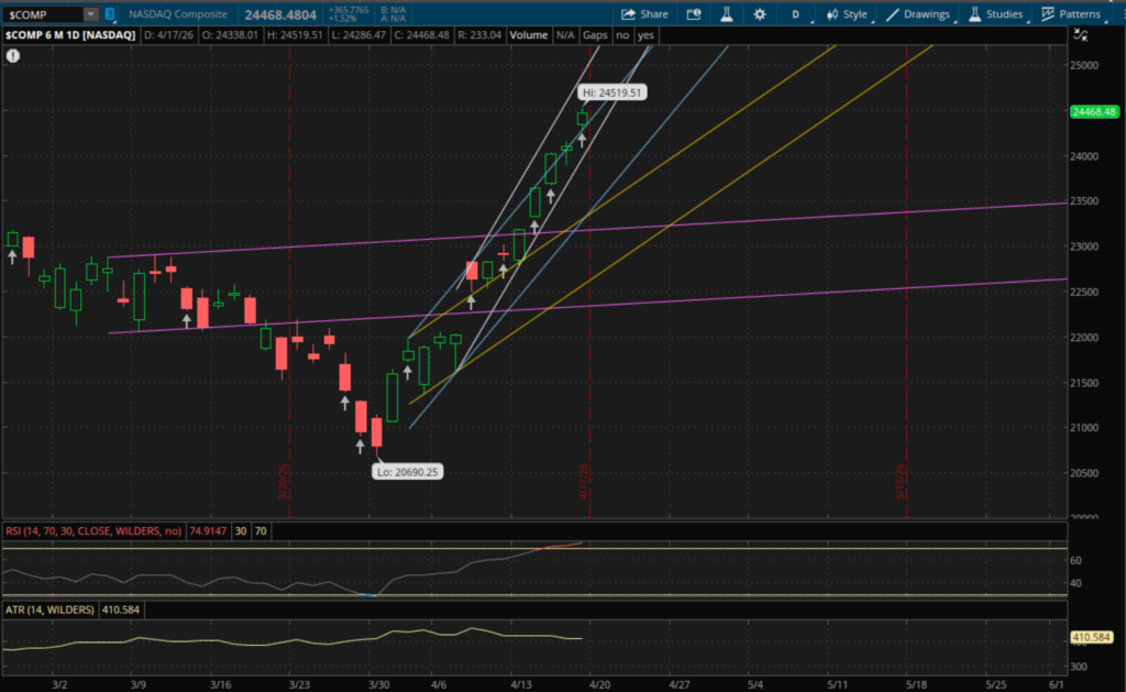 The first level to watch tomorrow will be from this same uptrend (blue) which will be right around 24,500. The Nasdaq closed at 24,468 so it will need to gap up again above 24,500 for that level to be support. If it fails to get that gap up above 24,500 then that level will be resistance. From there, the next support to watch on a pullback will be at 24,280-24,285 from its primary uptrend (white). If the Nasdaq does gap or break above 24,500 and resumes the rally, its only other resistance to watch will be from its primary uptrend (white) at about 25,200.