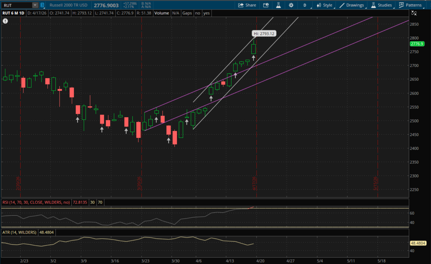 The Russell 2000 didn't break through its primary uptrend on Friday so it doesn't start any new trends. It put in a high of 2,793.12 which was just shy of its primary uptrend resistance around 2,800. This primary uptrend (white) will again be the only resistance to watch tomorrow which will be at 2,825. On a pullback, its primary uptrend will also be the first support to watch at 2,726. If that doesn't hold, then there would be more support at about 2,705 from its prior uptrend (purple).
