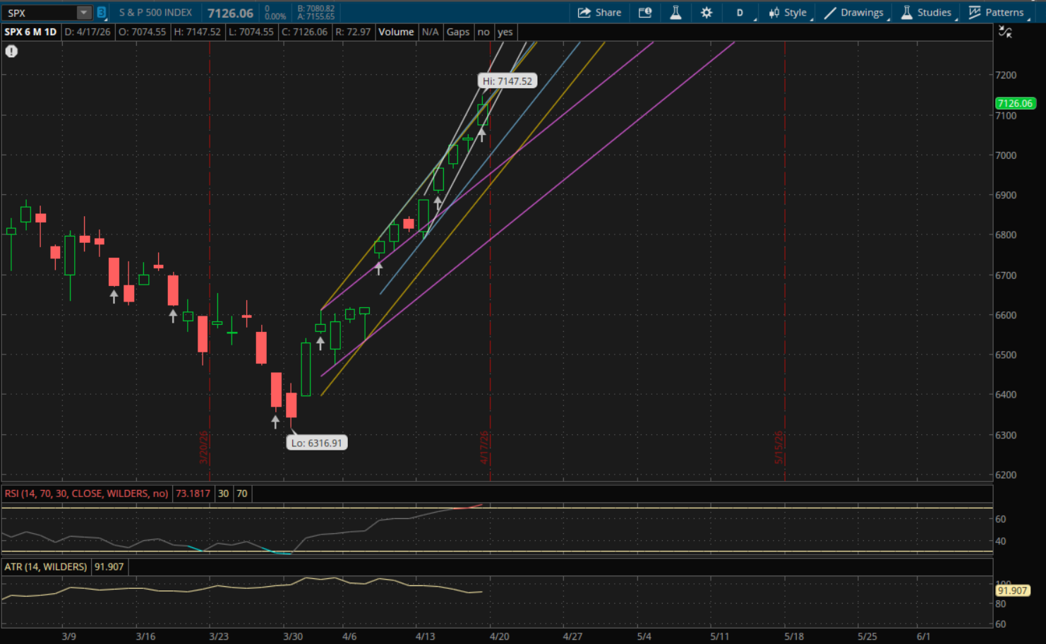 If the S&P fails to gap above its primary uptrend at 7,147 tomorrow, then that level becomes resistance. On a pullback the first support to watch would then be at about 7,025 from its prior uptrend (blue). There would be more supports at 6,968 and 6,950 from its next uptrends (purple and yellow).