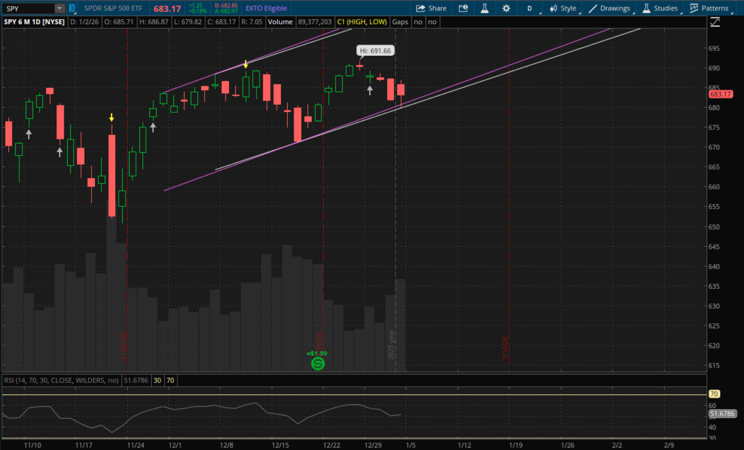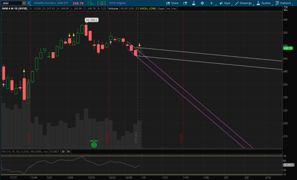 Today was the first trading day of 2026 and it was a bit of an odd one to say the least. There was a big gap up in the morning with QQQ leading and gaining as much as 1.4% at the highs of the day. But in the morning markets saw a sharp reversal and quickly went negative. While QQQ was leading in the morning, it finished the weakest, closing down 0.19%. SPY managed to finish green, up 0.18%. Meanwhile IWM was the standout after lagging in the morning as it finished up 1.06%.