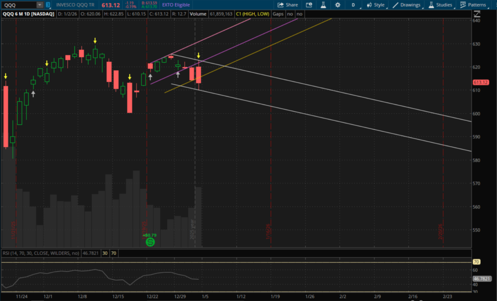 For the daily update, we'll start off with QQQ today. In the last daily update, before the New Year's holiday, I mentioned that if QQQ failed to close above the $615.35 area today that it would start a new downtrend. That new daily downtrend is now official with today's close of $613.12 - well below the $615.35 support. For Monday, this new downtrend support will be at about $609.50 while resistance on a bounce will be at about $616.75 from the prior uptrend that it closed below (yellow channel).