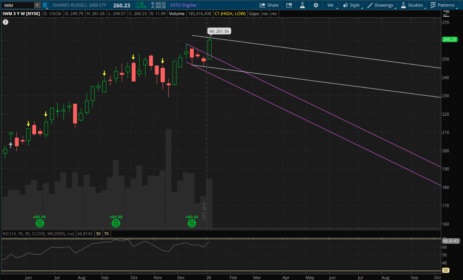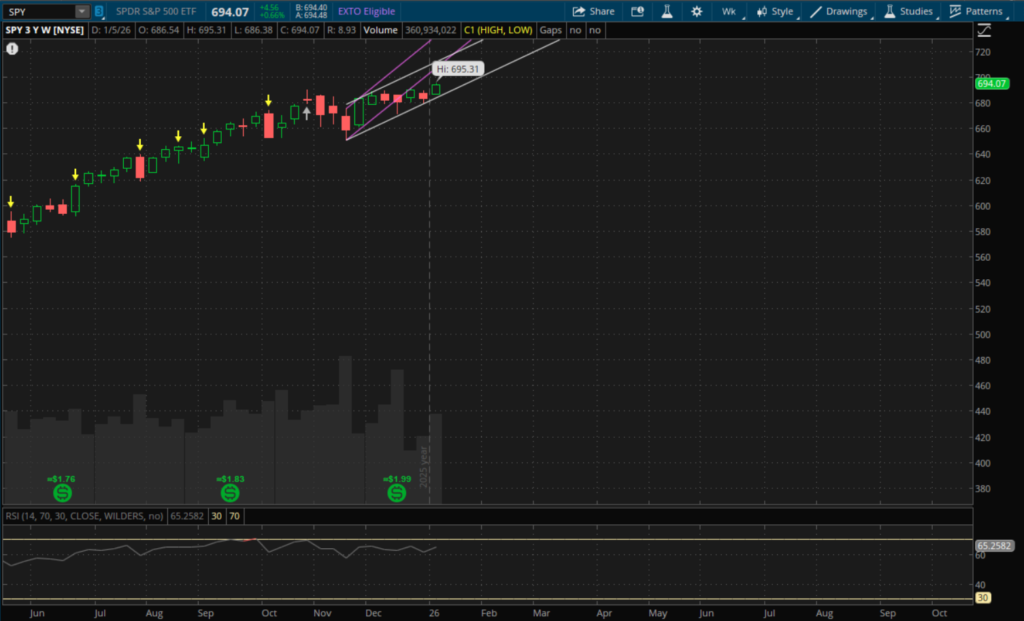 IWM's weekly downtrend didn't last long as it gapped up on Monday and was pretty much straight up for the week. It gained 4.6% this week and led the way higher as it hit new all time highs. QQQ had a nice bounce back week as well, logging a 2.2% gain. Meanwhile SPY gained 1.6% and also hit new all time highs. After briefly showing some signs of life, the VIX ended up flat for the week, settling back down at $14.49. Bitcoin was strong to start the week off but gave back all of its gains to essentially finish the week off flat as well. Earnings season kicks off this week with big banks reporting and the delayed Supreme Court tariff ruling could potentially happen this Wednesday, January 14th. This week we will also be going into a 3 day weekend with the markets being closed the following Monday, January 19th, for Martin Luther King Jr. Day.