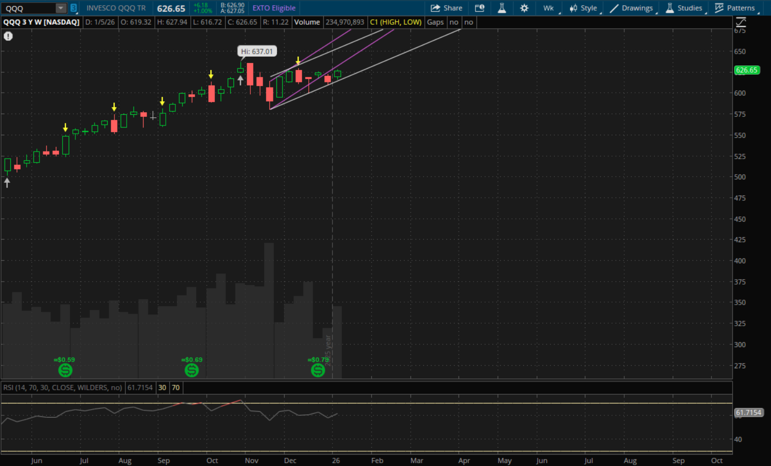 For QQQ, it broke through its prior weekly downtrend resistance from the all time highs, so that is no longer valid resistance. It didn't break through any other trends, including its current uptrend, so new trends will be started for this week. Support from its current primary (white channel) uptrend is at about $620 for this week. So that's the big level to watch if we do get a little pullback going. Resistance from the prior weekly uptrend (purple channel) is going to be at about $640.50.