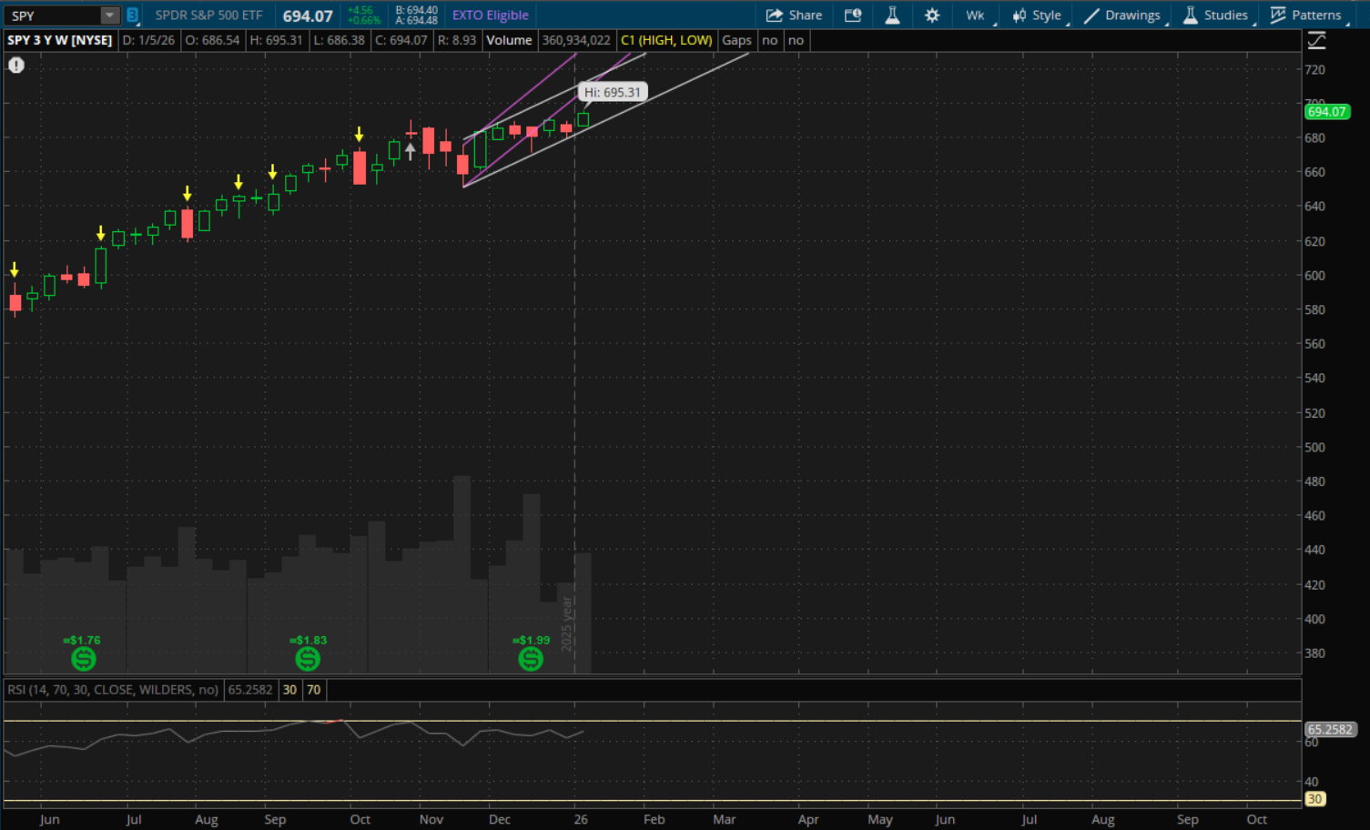 SPY looks almost identical to QQQ on weekly time frames as it also did not break through any support levels last week and remains with the same two uptrends. Support from its primary (white channel) uptrend this week will be at about $688.75 and that's the big level to watch on any pullback. Resistance from its primary uptrend (purple) is at about $716. If it were to break through that, then the next resistance from the primary channel would be a little higher at $717. These levels are about 3% away from current price, so we would need to see a pretty big rally this week to reach them. So probably unlikely we get there, but it's possible.